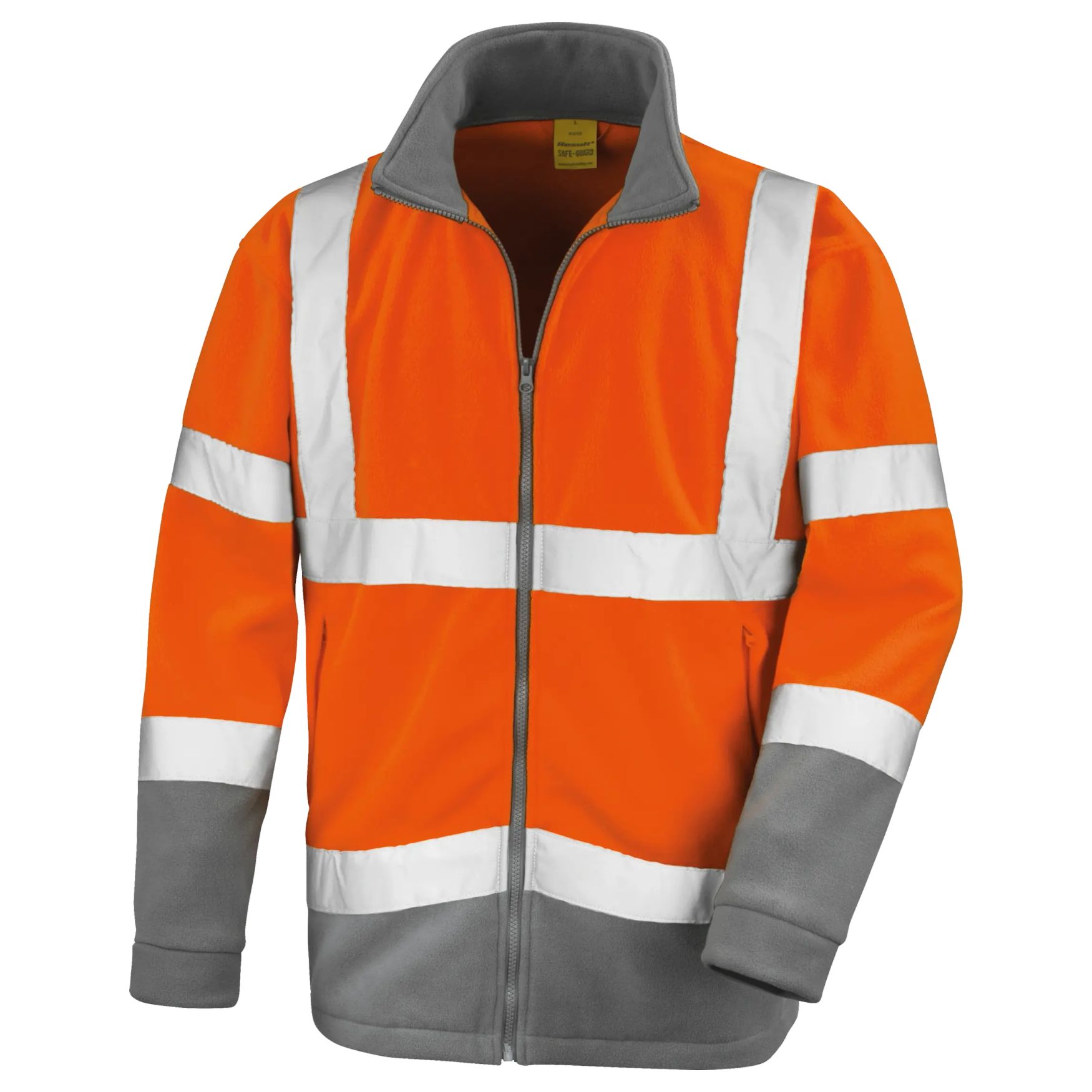 Sikkerhedsjakken Safety Microfleece er en mikrofleece i høj synlighed med reflekterende bånd og grå kontrastpaneler, der begrænser synligheden af snavs. Høj krave, rummelig pasform, sidelommer med lynlås. Mulighed for personalisering med logo.