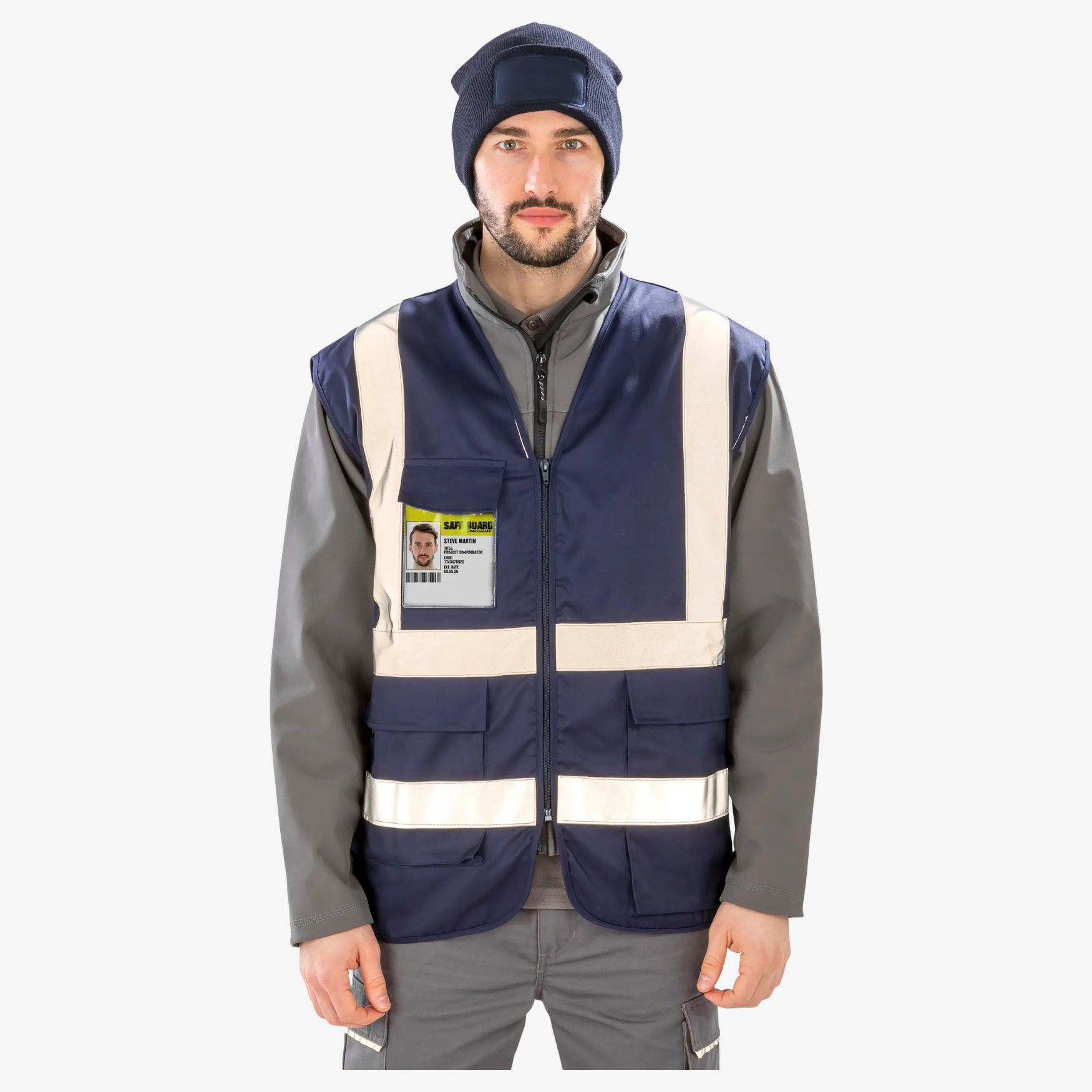 Polycotton Security vest er en sikkerhedsvest i polybomuld med lynlåslukning, refleksbånd på kroppen og skuldrene samt flere lommer, herunder en dyb lomme egnet til kontroludstyr. Brystlomme med plads til ID-kort, rummelig pasform, ophængsstrop og D-ring.
