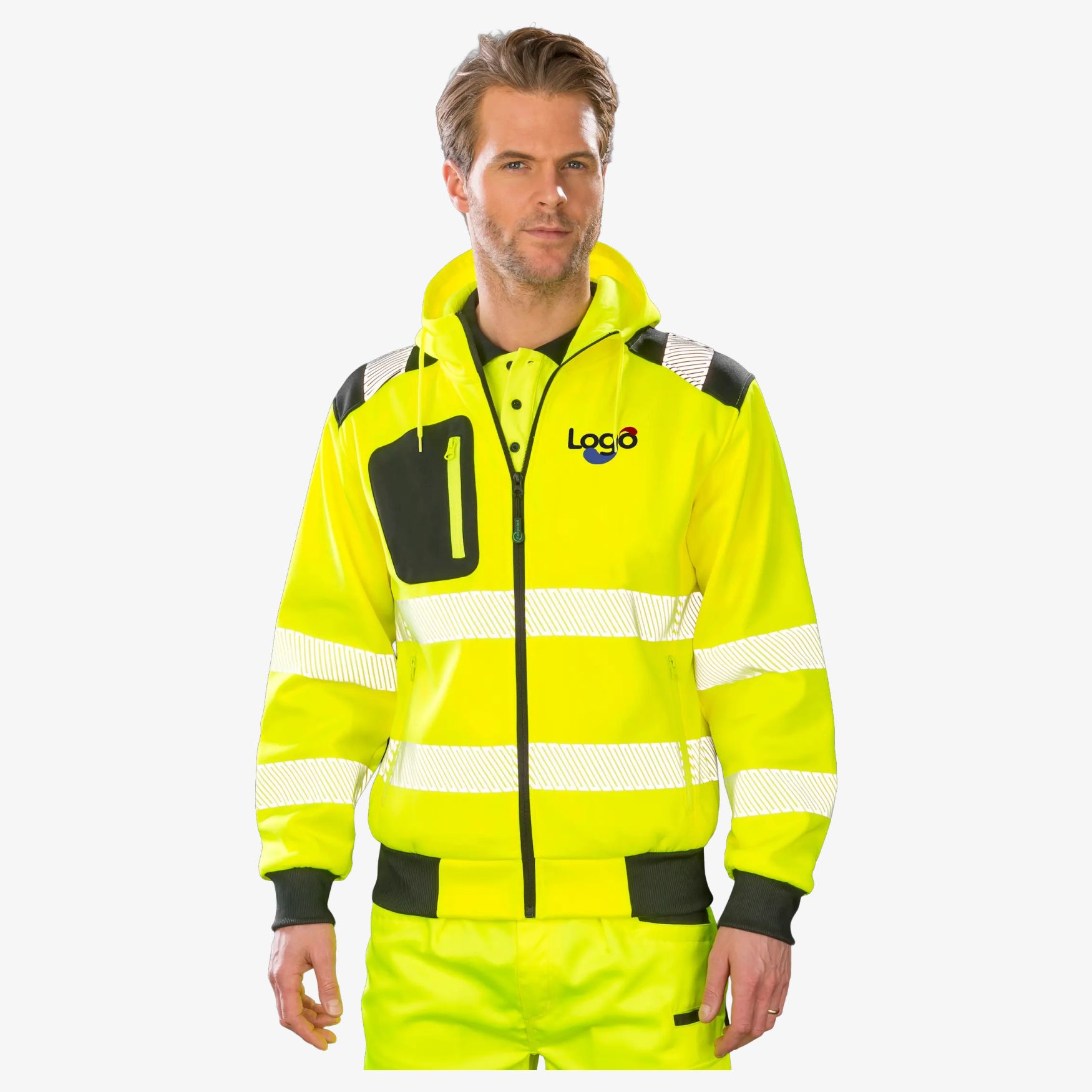 Sikkerhedshættetrøjen med lynlås er en vindtæt hættetrøje med hætte foret med fleece, med lynlåslukning og lynlåslommer. Reflekterende detaljer og trykte sikkerhedsbånd forbedrer synligheden. Manchetter og talje i elastisk ribstrik. Tilpasning mulig med tryk.