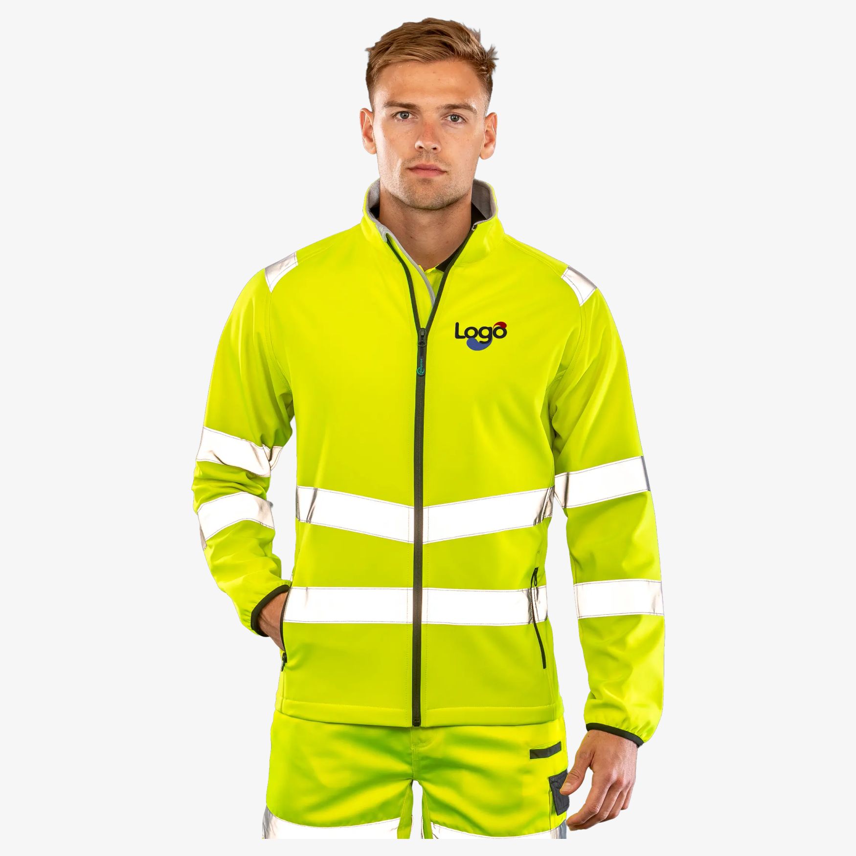 Den genanvendte sikkerheds-softshell er designet til professionel brug med refleksbånd på arme, skuldre og krop, mikrofleecefor og lynlåslukning med hagebeskyttelse. Tilpasning mulig via tryk.