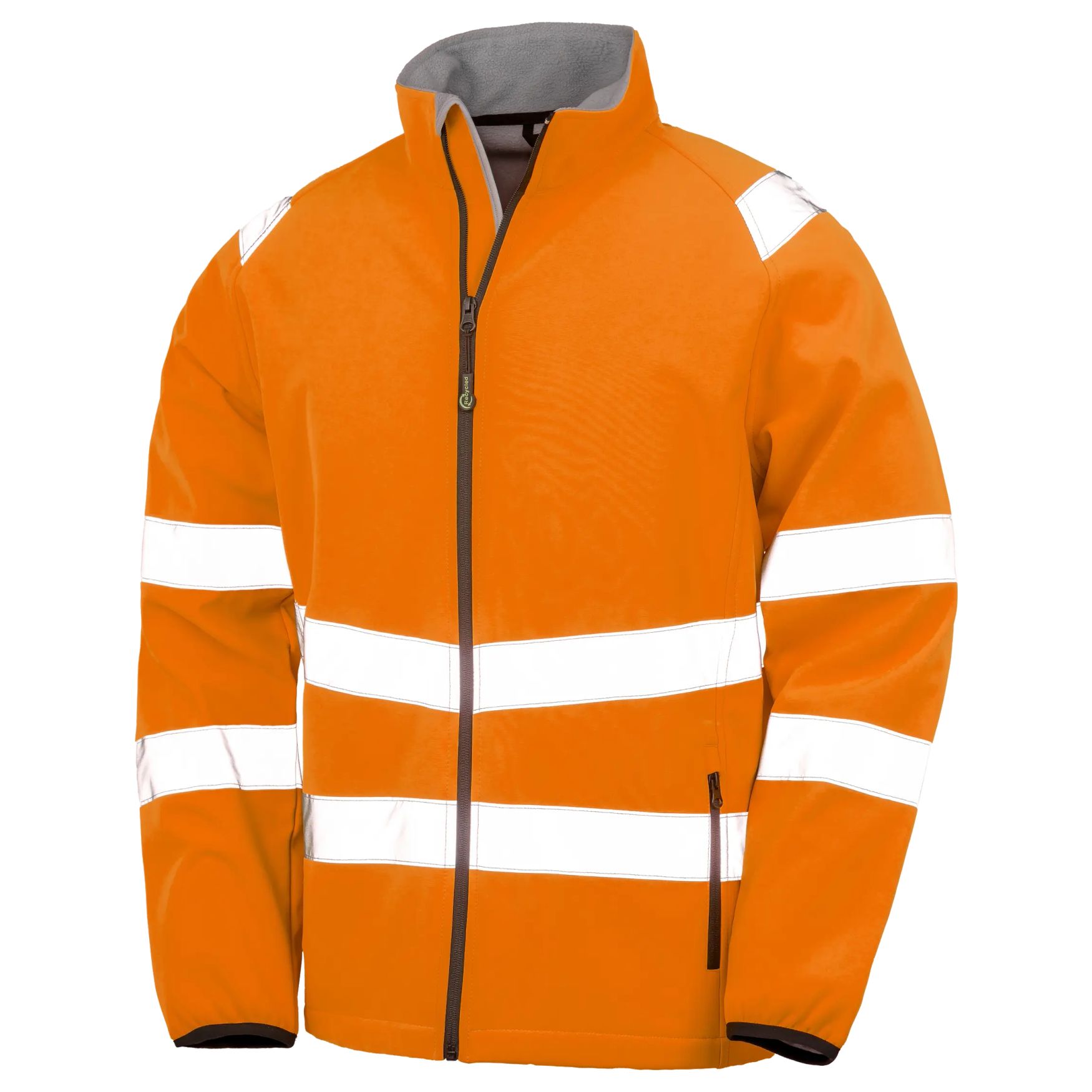 Den genanvendte sikkerheds-softshell er designet til professionel brug med refleksbånd på arme, skuldre og krop, mikrofleecefor og lynlåslukning med hagebeskyttelse. Tilpasning mulig via tryk.