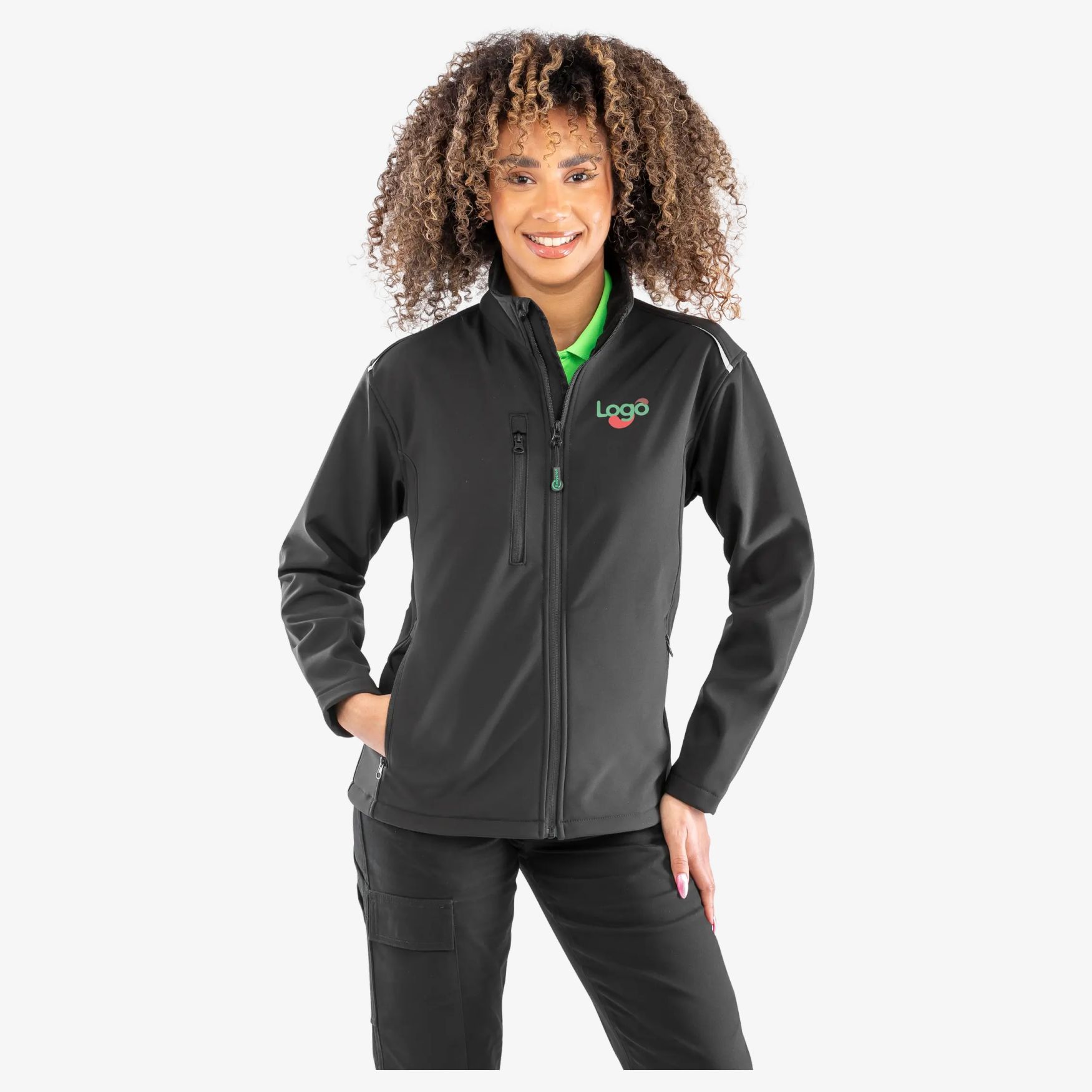Softshelljakken i genanvendt materiale er en genanvendt damejakke med blød overflade, designet til at begrænse luftindtrængning og fremme bortledning af fugt. Lynlåslukningen, den høje krave og lynlåslommerne gør den nem i daglig brug. Tilpasning mulig med tryk.