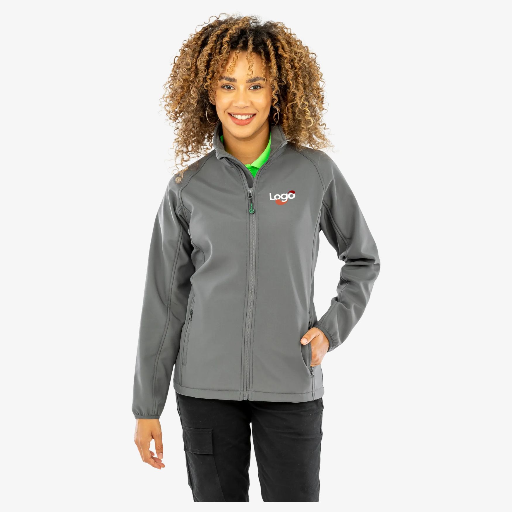 Den genanvendte softshelljakke er en let softshelljakke i genanvendt polyester med blød fornemmelse. Åndbart materiale, vindtæt og vandafvisende. Lynlåslukning foran med aftagelig lynlåstrækker, kantbåndede manchetter, fladsømskant, figursyet talje og ophængsstrop.