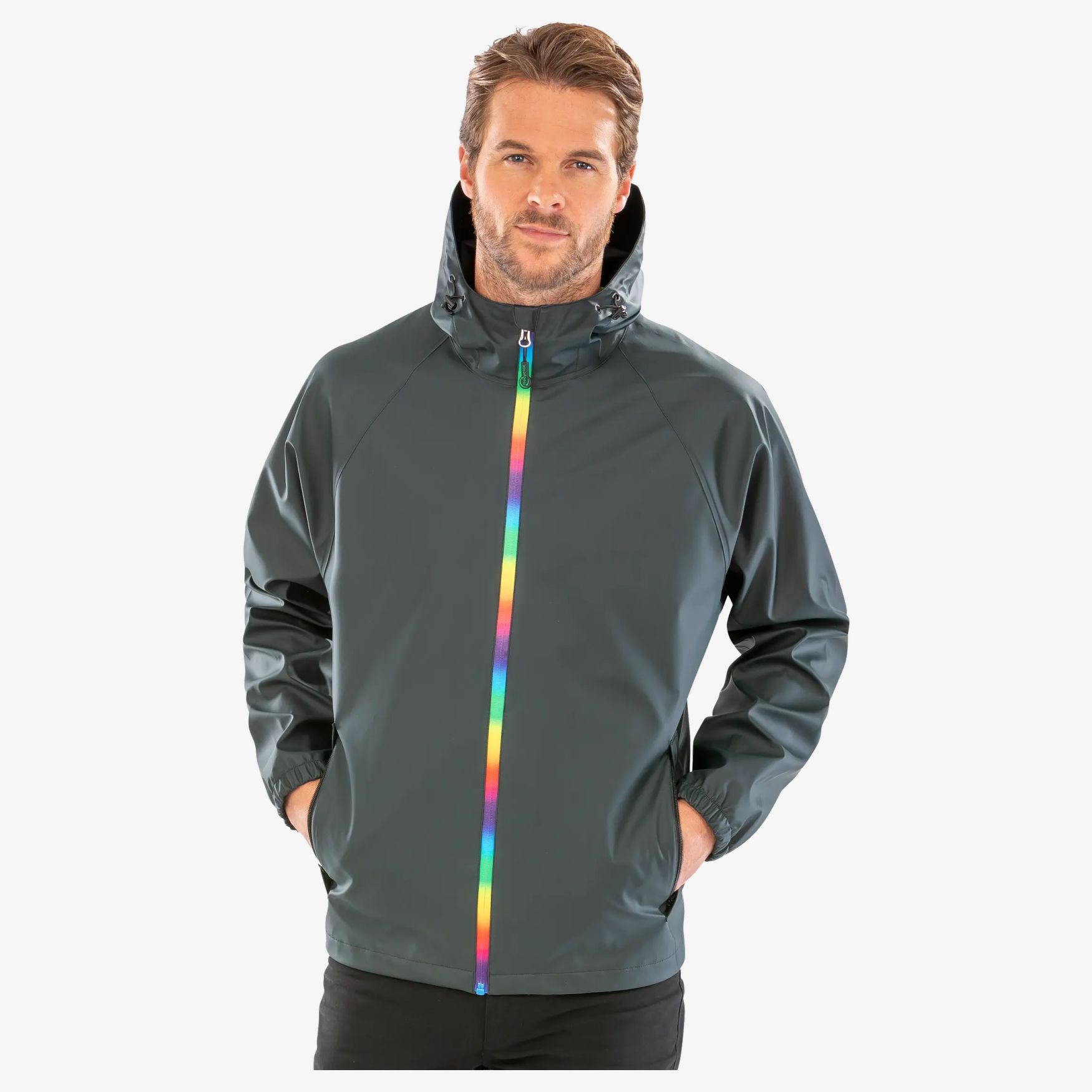 Rainbow vandtæt jakke til transport i fugtigt vejr, med integreret hætte, elastiske manchetter og sidelommer med lynlås. Vandtæthed 3000 mm og åndbarhed 1000 mvp.