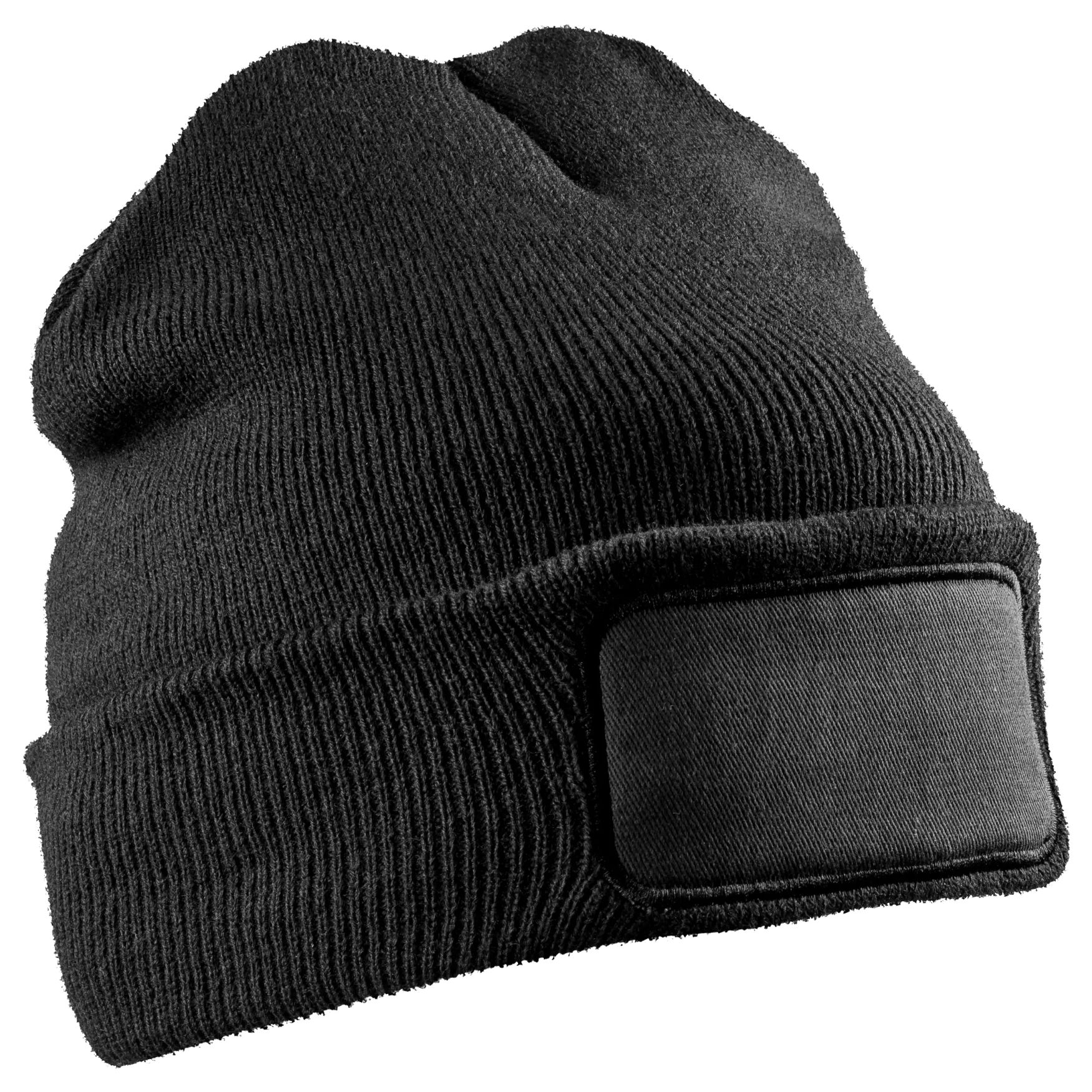 Dobbelt Genanvendt Hue er en dobbeltlags hue i kraftig strik med stor ombukket kant og polyesterpatch. Den dækkende strik egner sig til daglig brug. Tilpasning mulig på patchen.
