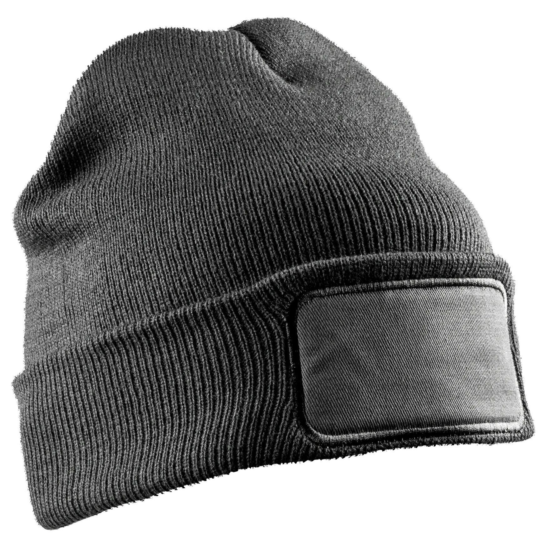 Dobbelt Genanvendt Hue er en dobbeltlags hue i kraftig strik med stor ombukket kant og polyesterpatch. Den dækkende strik egner sig til daglig brug. Tilpasning mulig på patchen.