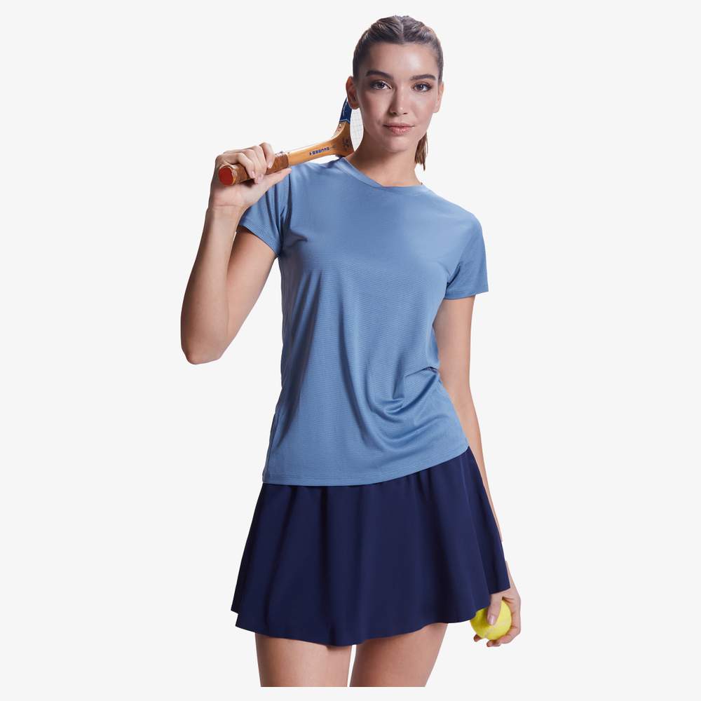 T-shirt teknik med korte ærmer for kvinder. Let stof af genbrugspolyester. Hals med korsdetaljer og dækende sømme. Indsæt på ryg og ærmene af vejrtrækkende stof. Sømme forsynet med hældning på forsiden, siderne og skuldrene. Afrundet bund. Kombineret i vejrtrækkende og elastiske stoffer. Fjernbar etiket.