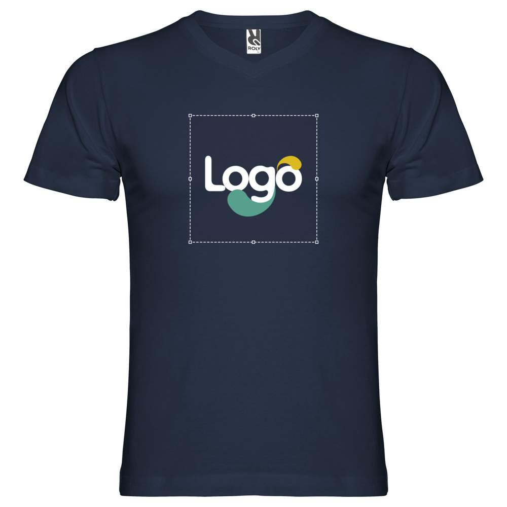 T-shirt med korte ærmer, skåret tubulært med V-hals med dobbelt lag. Rensningsstrimmel på hals og skulder. Fjernbart etiket. Sammensætning: 100% bomuld, enkelt jersey (undtagen grå farvetone: 85% bomuld, 15% viskose). Dette t-shirt tilbyder en ideel base for udtryk for deres visuelle identitet. Det kan personaliseres med deres logo, farver eller ethvert andet grafisk element for at imødekomme deres specifikke behov.