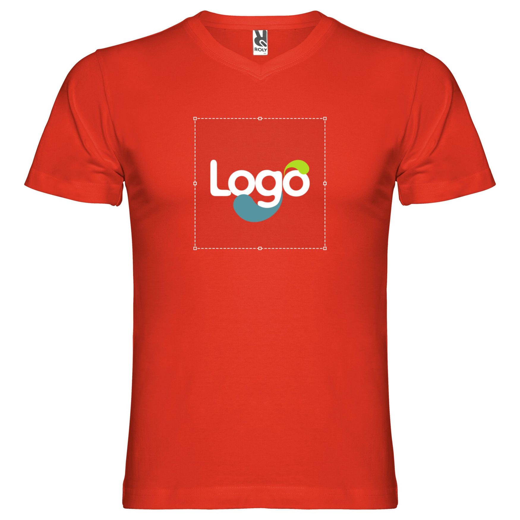 T-shirt med korte ærmer, skåret tubulært med V-hals med dobbelt lag. Rensningsstrimmel på hals og skulder. Fjernbart etiket. Sammensætning: 100% bomuld, enkelt jersey (undtagen grå farvetone: 85% bomuld, 15% viskose). Dette t-shirt tilbyder en ideel base for udtryk for deres visuelle identitet. Det kan personaliseres med deres logo, farver eller ethvert andet grafisk element for at imødekomme deres specifikke behov.