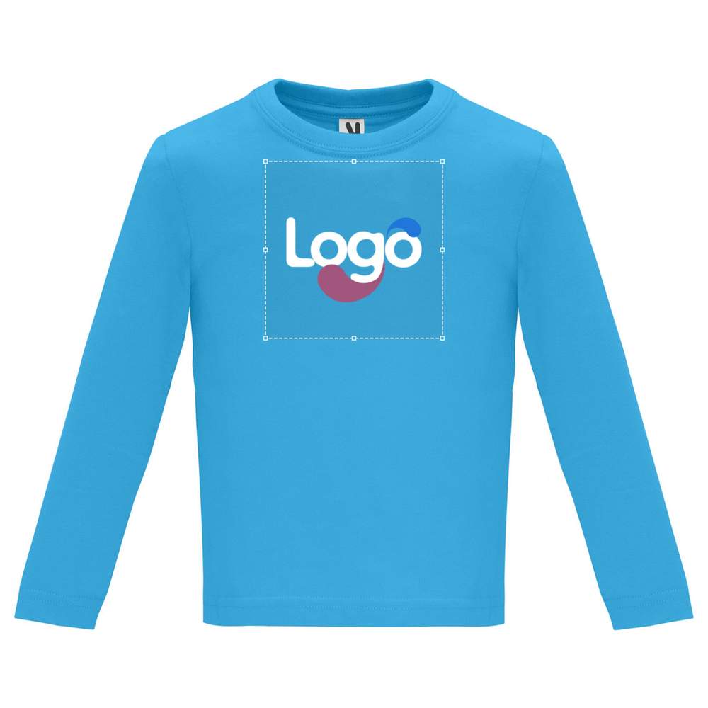 Langermet T-shirt spesielt utformet for barn, vevd i kamgarn for en kompakts og behagelig opplevelse. Den har et rundt halshull og en skulderåpning med trykkknapper, tilgjengelig fra størrelsen 6M til 18M. Størrelser på 2A har ingen skulderåpning. Side sømmer for optimal komfort. Dette T-shirtet er ideelt for personliggjøring, enten det gjelder å legge til logoen din, en visuell eller noe annet grafisk element etter eget valg.