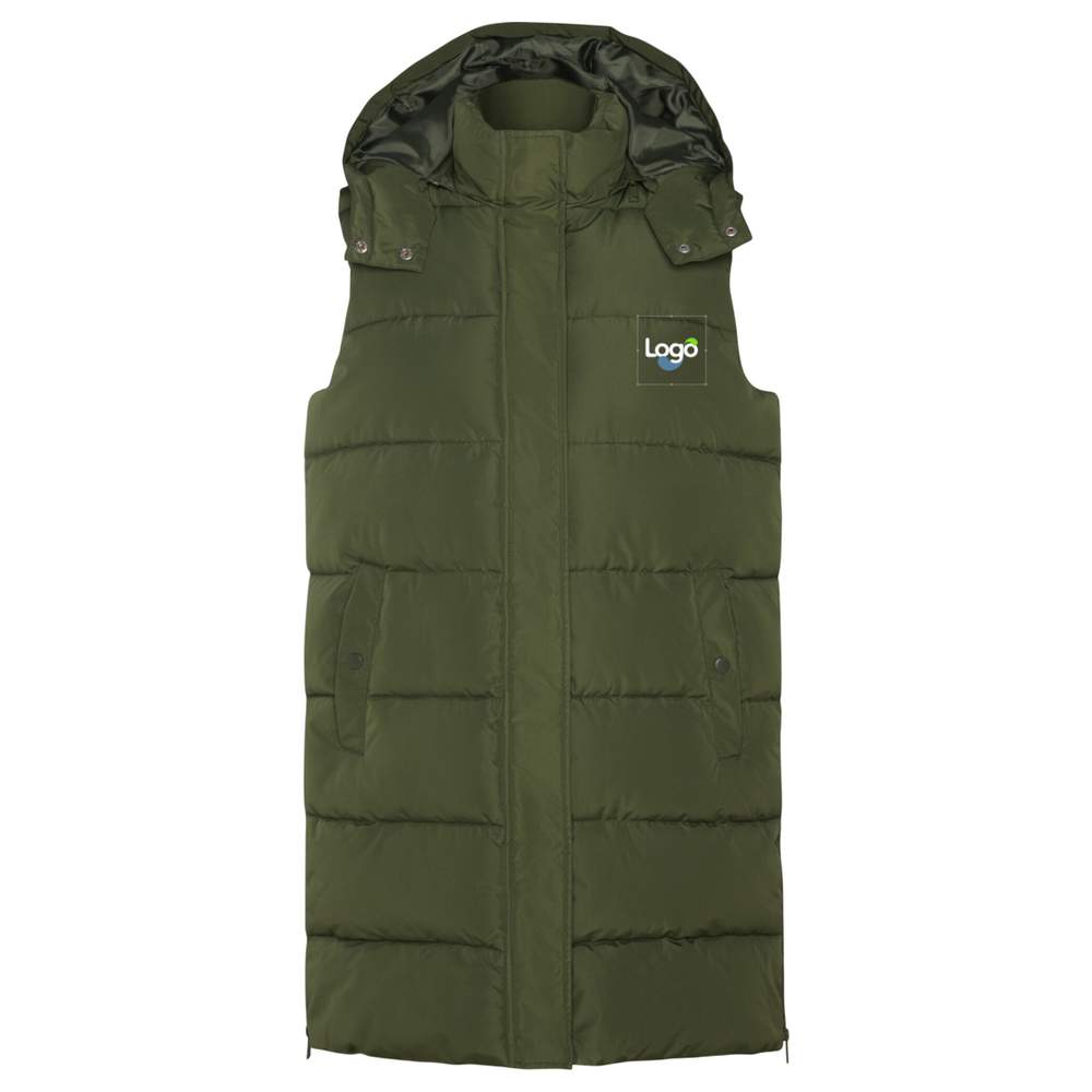 Ærmeløs fyldt vest af typen dynetøj til kvinder. Afmonterbar kappe. Højt krave. Skjult forside lomme med zip. To lommer med trykknapper. Sideåbninger med zip. Indvendig adgang til brystet til markering. Afmonterbar etiket. Sammensætning: Ydre stof: 100 % polyester, fyld: 100 % polyester, foder: 100 % polyester. Denne vest tilbyder en ideel overflade til tilpasning med broderi, hvilket gør det muligt at tilføje dit logo eller dine grafiske elementer.