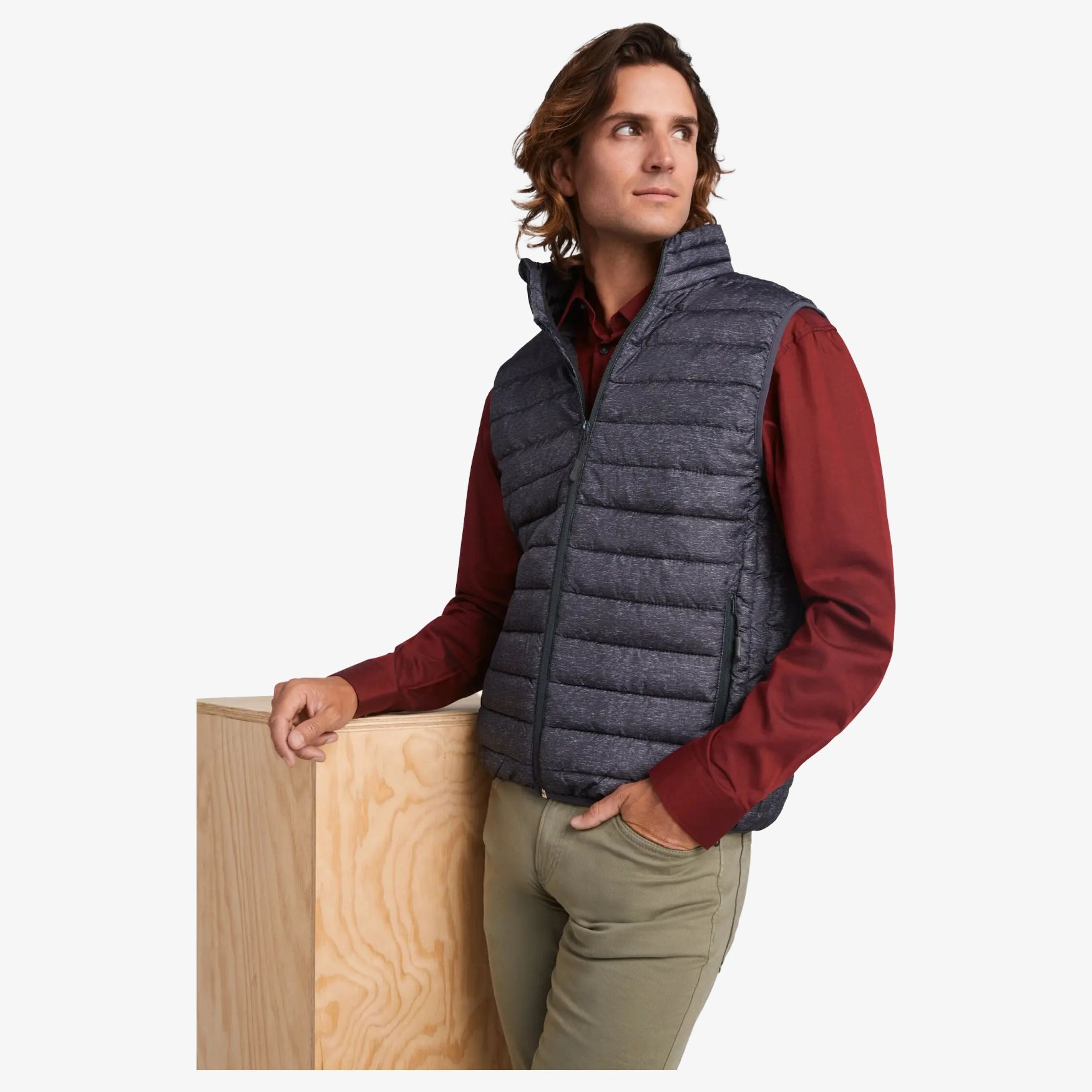 Fyldt jakke med fuglefjer berøring. Matchende revers zippes med hagebeskyttelse og glideskruer. To sider på siderne med zipper. Kant på armhuler og bund af bælte. Indvendig kontrasterende foring. Let og foldbart tøj. Vandafvisende. Model mod vind.