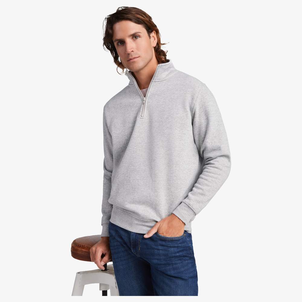 Sweat med halv zip ton på ton og opvarmet krage. Inderside af hals samme farve. Forstærkning af rensestrimmel inde i kraven. Ærmer og talje i 1x1 rib. Sammensætning: 50% bomuld, 50% polyester, (undtagen gråfarvet: 55 % bomuld, 40 % polyester, 5 % viskose). Moltonvæv