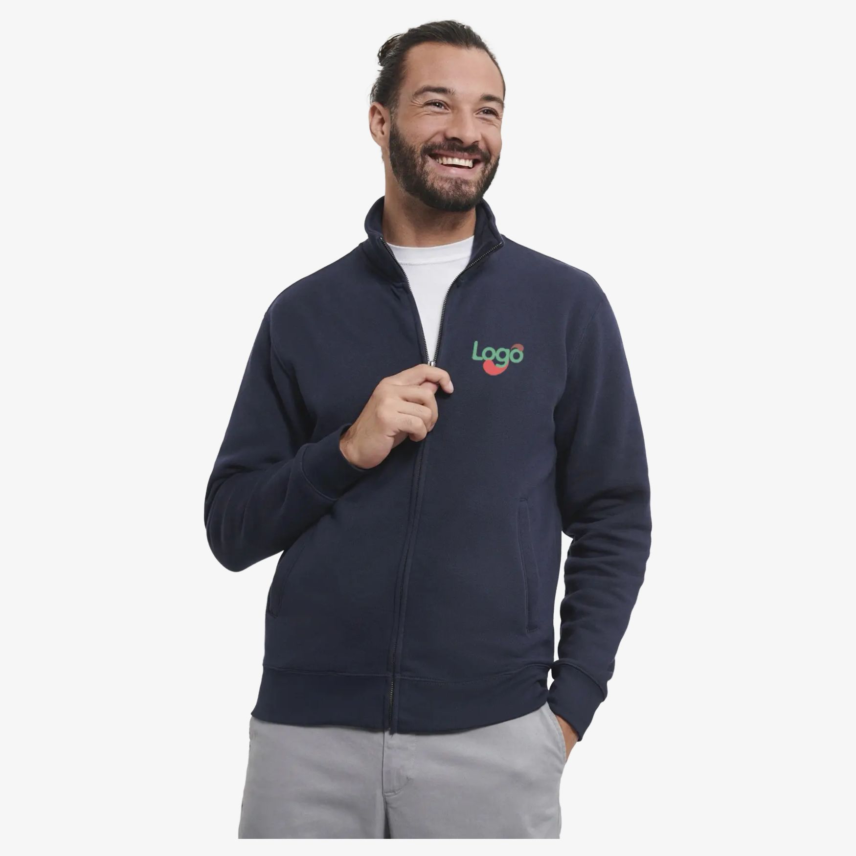 The zipped sweat jacket for men features a straight and contemporary cut with a cadet collar in the same material. It has integrated pockets and headphone access. Seams are visible on the front shoulder and covered at the armholes and cuffs. The metal zipper is covered.