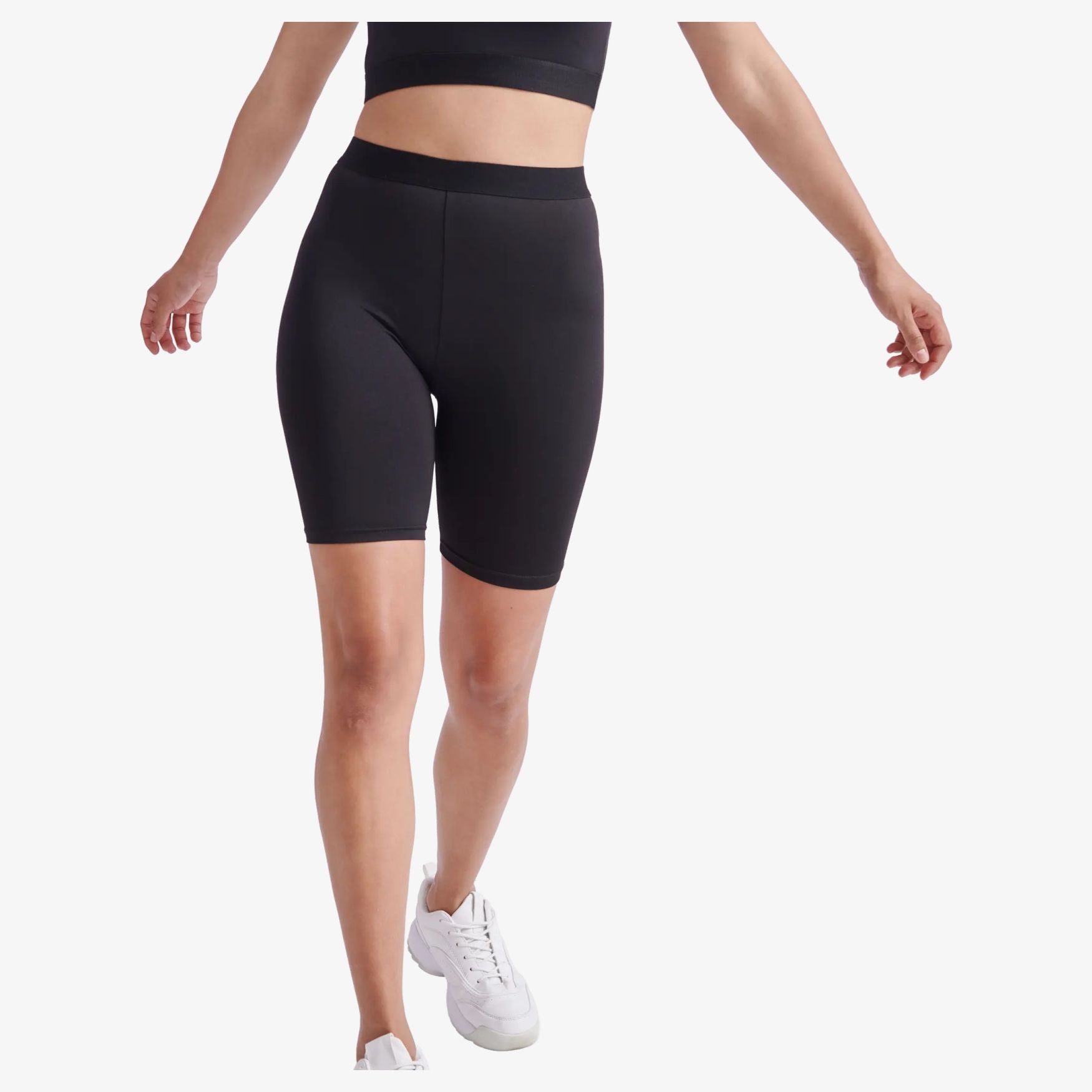 Cykelshorts til kvinder har elastisk talje egnet til sublimation. Stoffet er ikke gennemsigtigt.