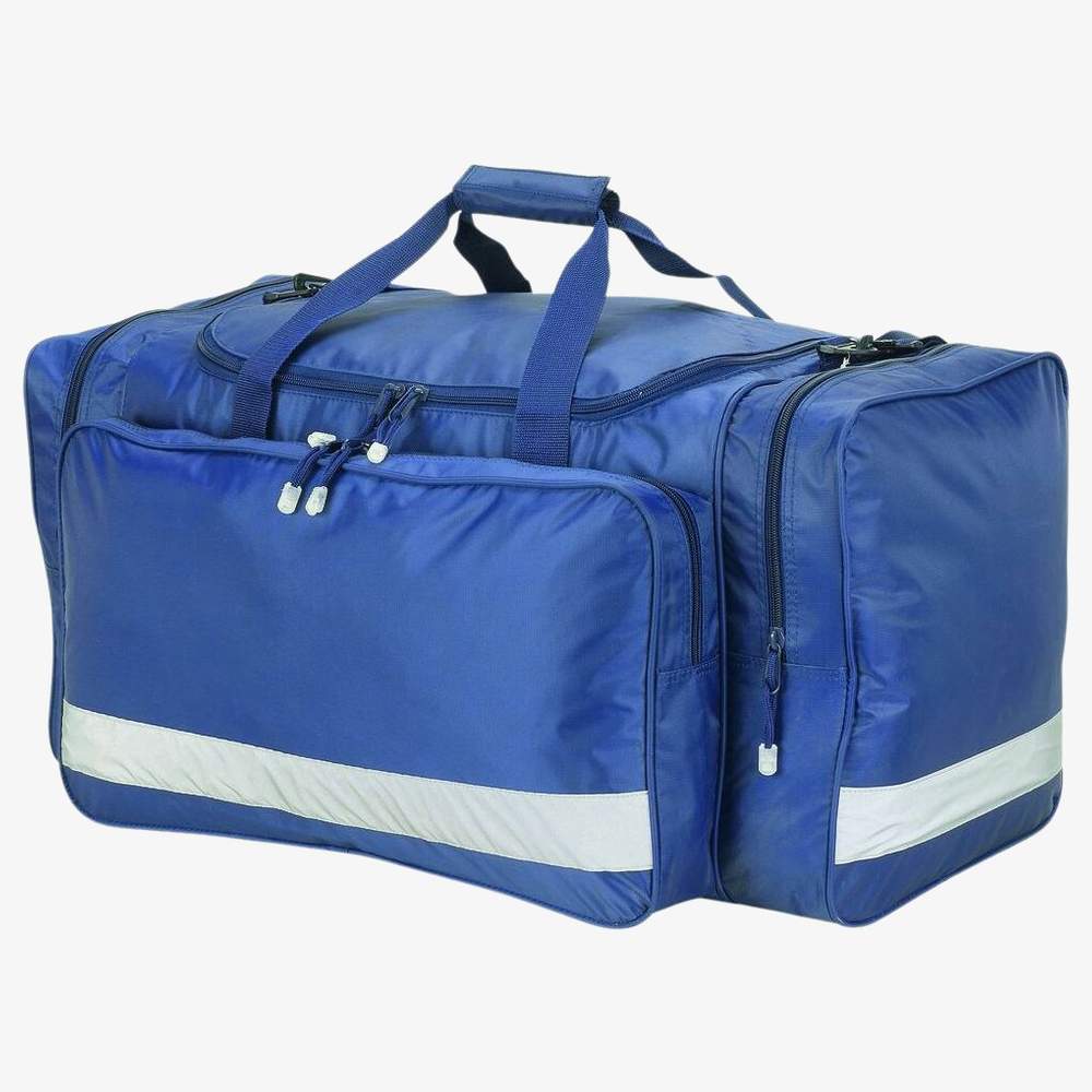 En stor sportstas designet til transport af udstyr. Den tilbyder et stort hovedrum til rummelige genstande, samt to lommer i hver ende og en frontlomme til organiseret opbevaring. Reflekterende bånd er til stede på tre sider for øget synlighed. Den forstærkede håndtag sikrer en behagelig og sikker håndtering, suppleret med en låsning med klæbende bånd.