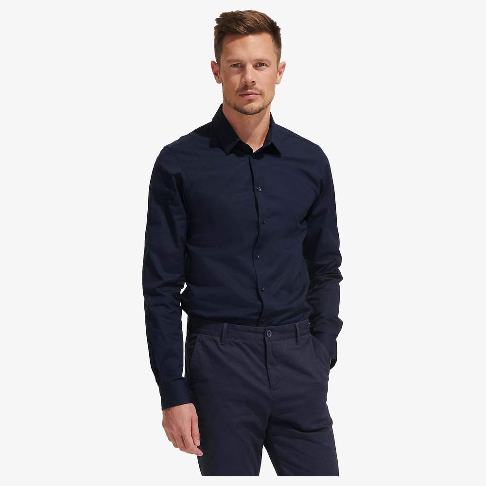 Trøje til mænd stretch, skuret justeret, to indsnit på bagsiden af taljen, klassisk moderne krave, lap med 8 knapper i samme farve. 97% bomuld, 3% elastan.