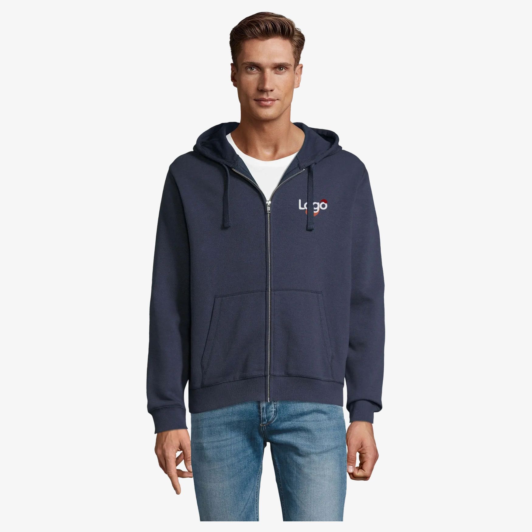Mænds jakke med zip og kappe. Monterede ærmer. To kænguru-lommer, sømskåret. Kappe med indlagt snor i tone-i-ton. Mansjetter og nederdel i bordkost 2x2. Halvmåne inde i kraven. Renhedsstrop på krævets inderside. 80% ringspun bomuld 20% polyester. Indvendigt skrubbet. Udvendigt 100% bomuld. Mulighed for personalisering med broderi eller dit logo.