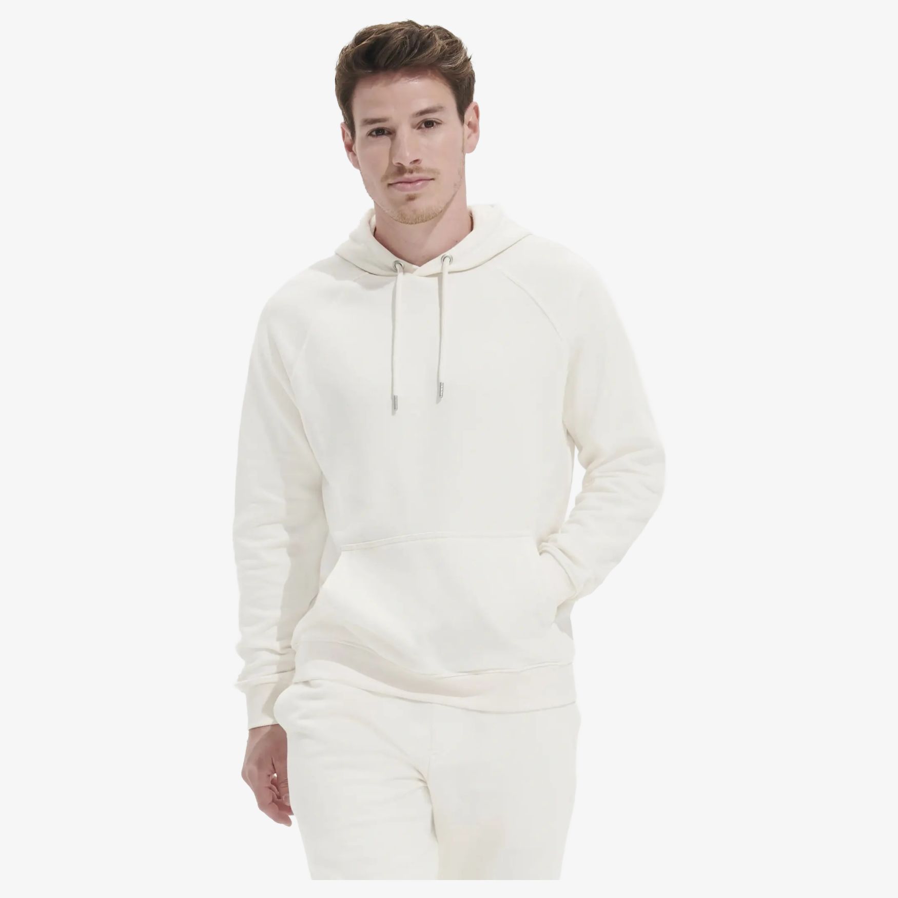 Unisex-sweatshirt med hætte. Model skåret syet med raglanærmer. Mansjetter og bundkanter i kantstykning 2x2. Halvmåne inde i kraven og indvendig renhedsstripe. Trækstrenge med øjeblikke og metalender. Foringet hætte i jersey. Sammensætning: 80% økologisk bomuld, 20% genbrugspolyester; 3 tråde; Indvendigt skrabet; Udvendigt 100% økologisk bomuld.