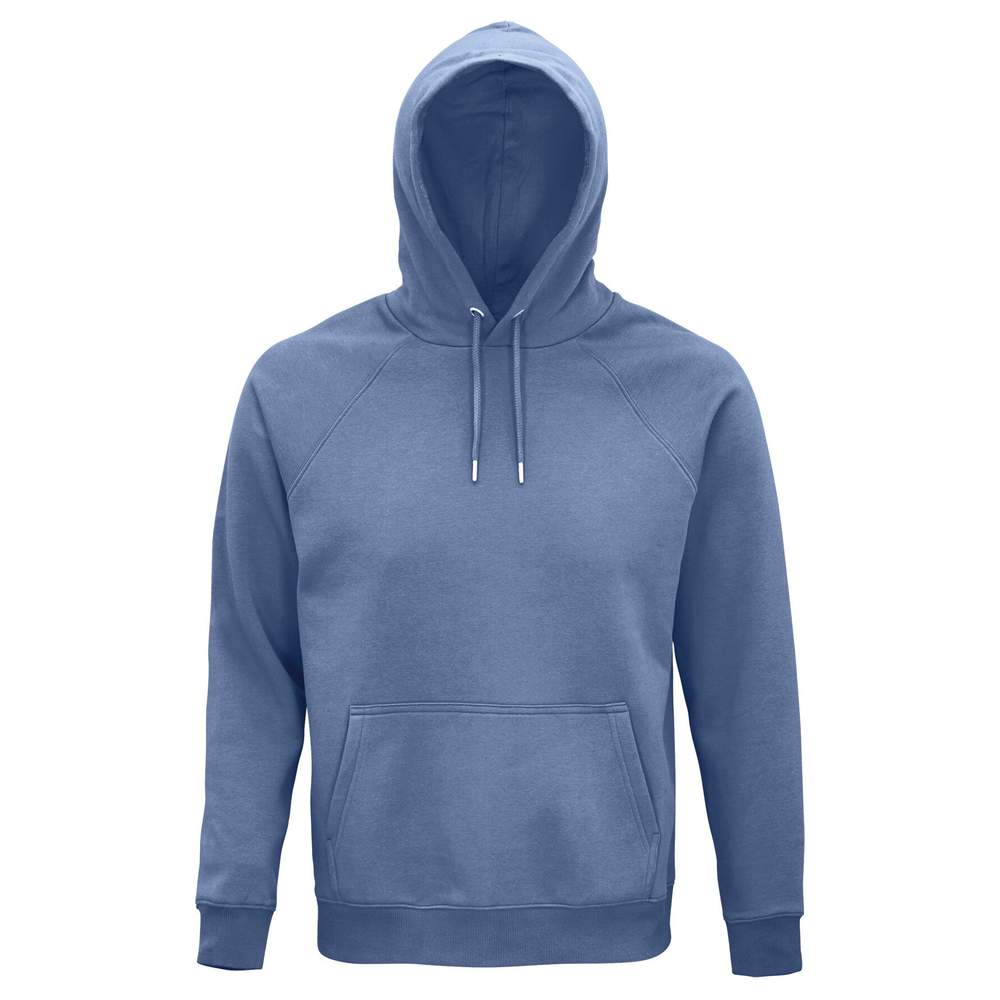 Unisex-sweatshirt med hætte. Model skåret syet med raglanærmer. Mansjetter og bundkanter i kantstykning 2x2. Halvmåne inde i kraven og indvendig renhedsstripe. Trækstrenge med øjeblikke og metalender. Foringet hætte i jersey. Sammensætning: 80% økologisk bomuld, 20% genbrugspolyester; 3 tråde; Indvendigt skrabet; Udvendigt 100% økologisk bomuld.