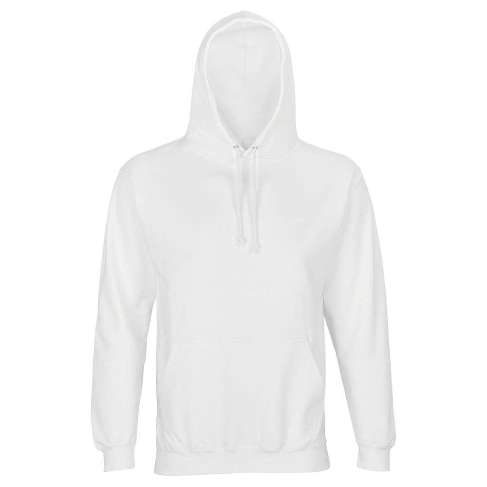 Unisex sweatshirt med hætte. Monterede ærm og skåret søm. Bundkant 1x1 til håndleddet og bunden. Kængurupose. Dobbelt hætte med snor i samme farve og metaløjet. Halvmåne og rengøringsbånd på jersey i halsen.