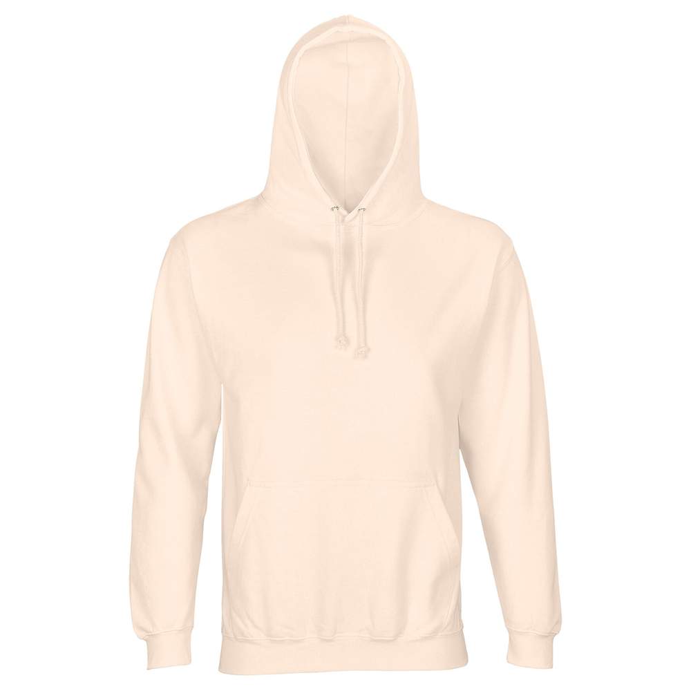 Unisex sweatshirt med hætte. Monterede ærm og skåret søm. Bundkant 1x1 til håndleddet og bunden. Kængurupose. Dobbelt hætte med snor i samme farve og metaløjet. Halvmåne og rengøringsbånd på jersey i halsen.