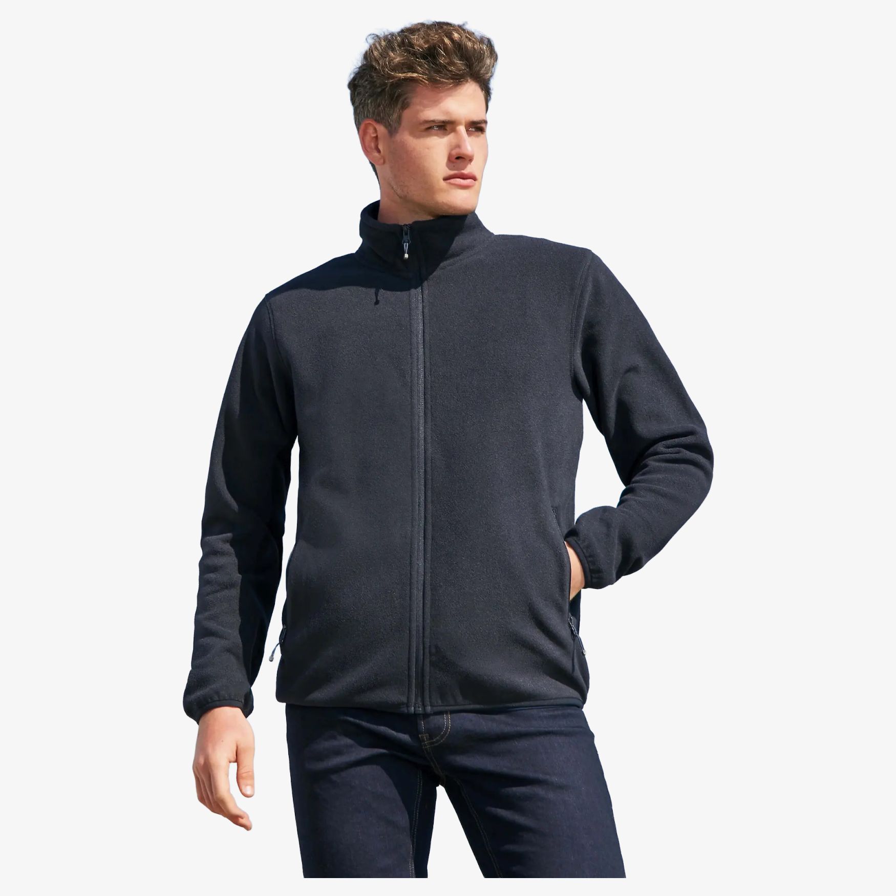 Mikropolarjakke med zip til mænd. Forpocket og hovedåbning med zip og kontrasttrækstang. Forstærkende bånd på krave. Elastiske kanter på ærmene og bunden.