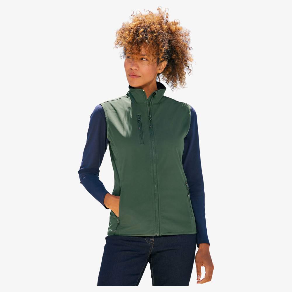 Vest til kvinder uden ærmer, lavet af polar zippede sofshell materiale. Den har en forfremmet zipåbning samt to sidelommer og en brystlomme, alle med zip-lukning. Kontrastfarvede zipper tilføjer en visuel detalje. Elastikbånd er placeret på armhulerne og nederste del for en behagelig pasform. Vestens sammensætning er 94% genbrugt polyester og 6% elastan. Den består af 3 lag, med en indre polar del af 100% polyester og en vandtæt og åndbar membran.