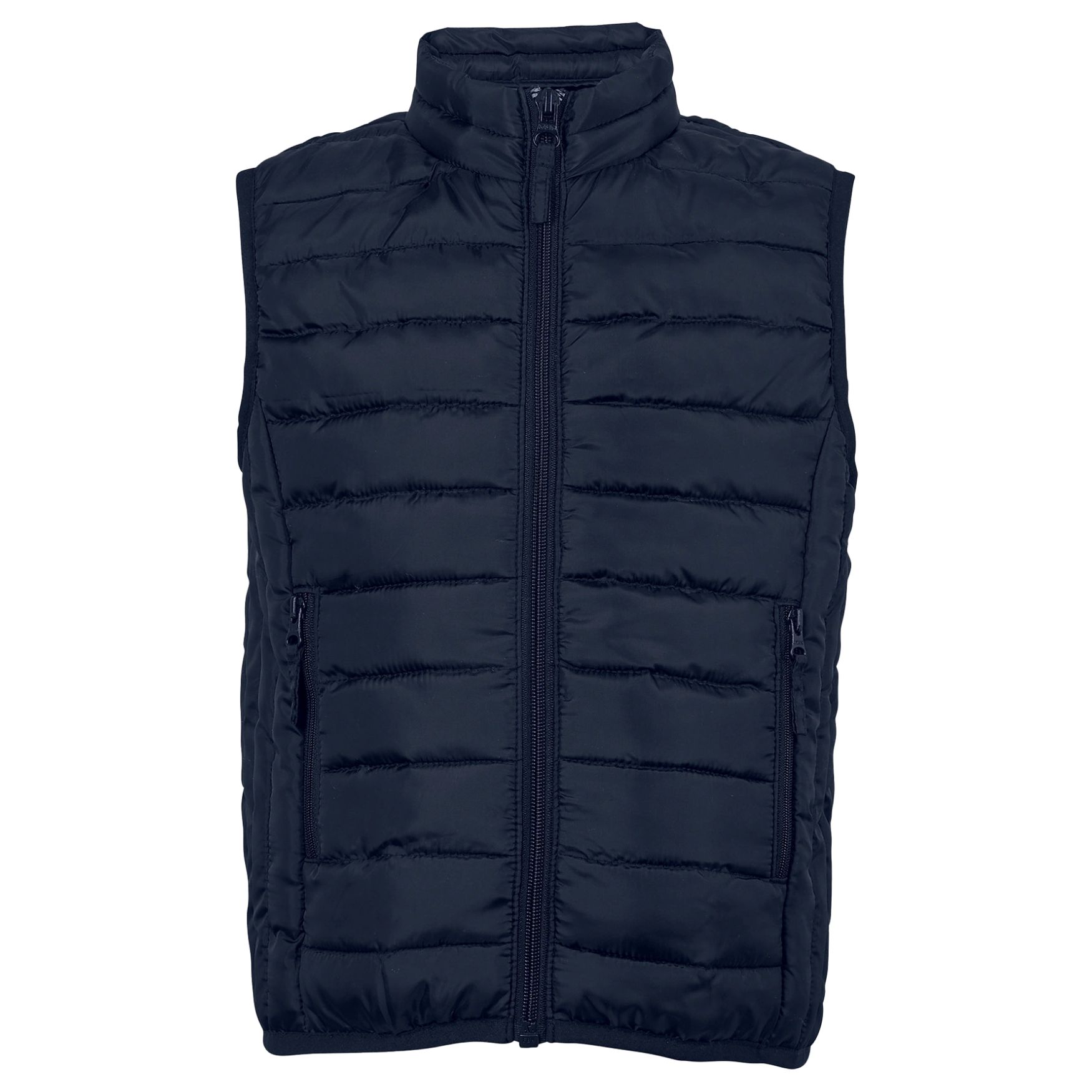Den lette ærmeløse jakke til børn er lavet af genanvendt polyester til yderside og foer med dunpolstring 100 % polyester. Den har høj krave og hovedlukning med sidelommer med ton-i-ton nylonlynlåse. Bund og ærmegab afsluttes med elastisk kantbånd. Opbevaringspose følger med.