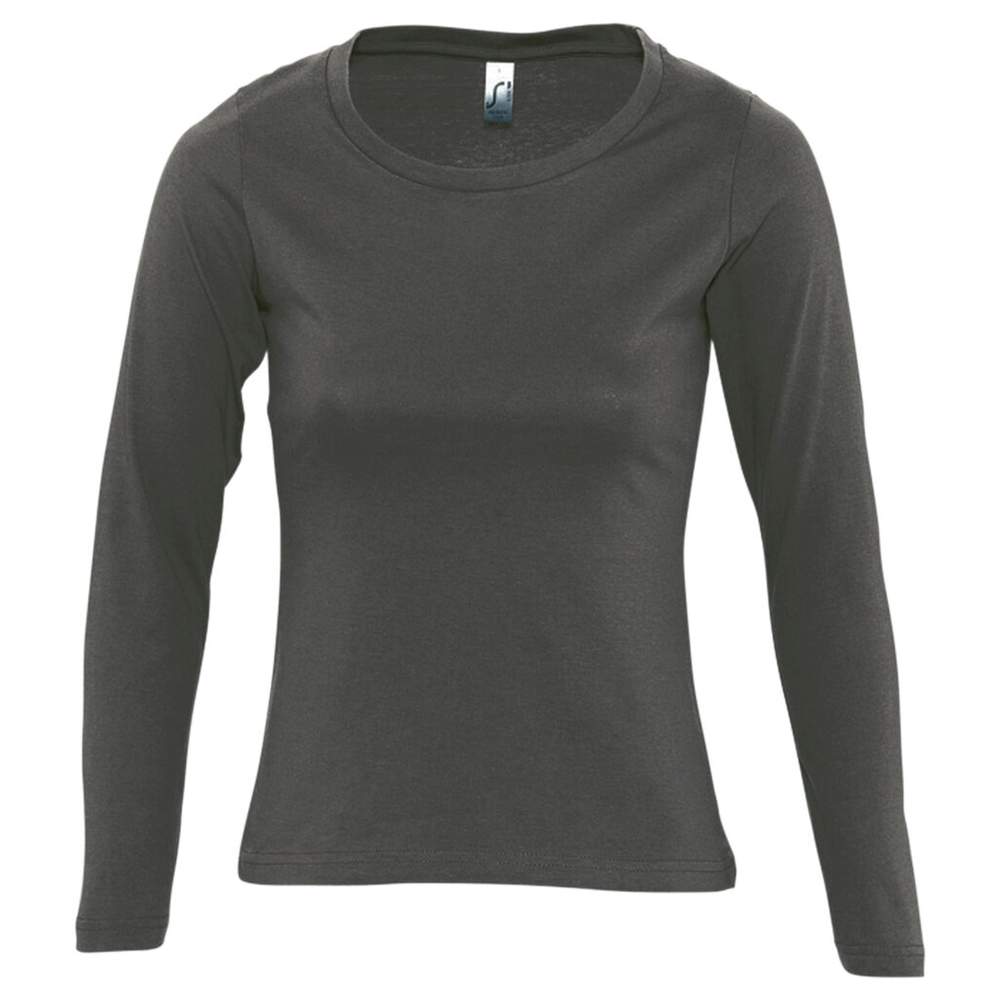 T-shirt dame rundhals lange ærm, lavet af jersey 150, 100% halv-kæmmet bomuld. Den har en renhedsstrimmel i halsen og et rundt hals med kant af elastisk materiale. Skæret er klassisk og lidt indsnævret, med ærm uden kant af elastisk materiale og forstærkede sømme.