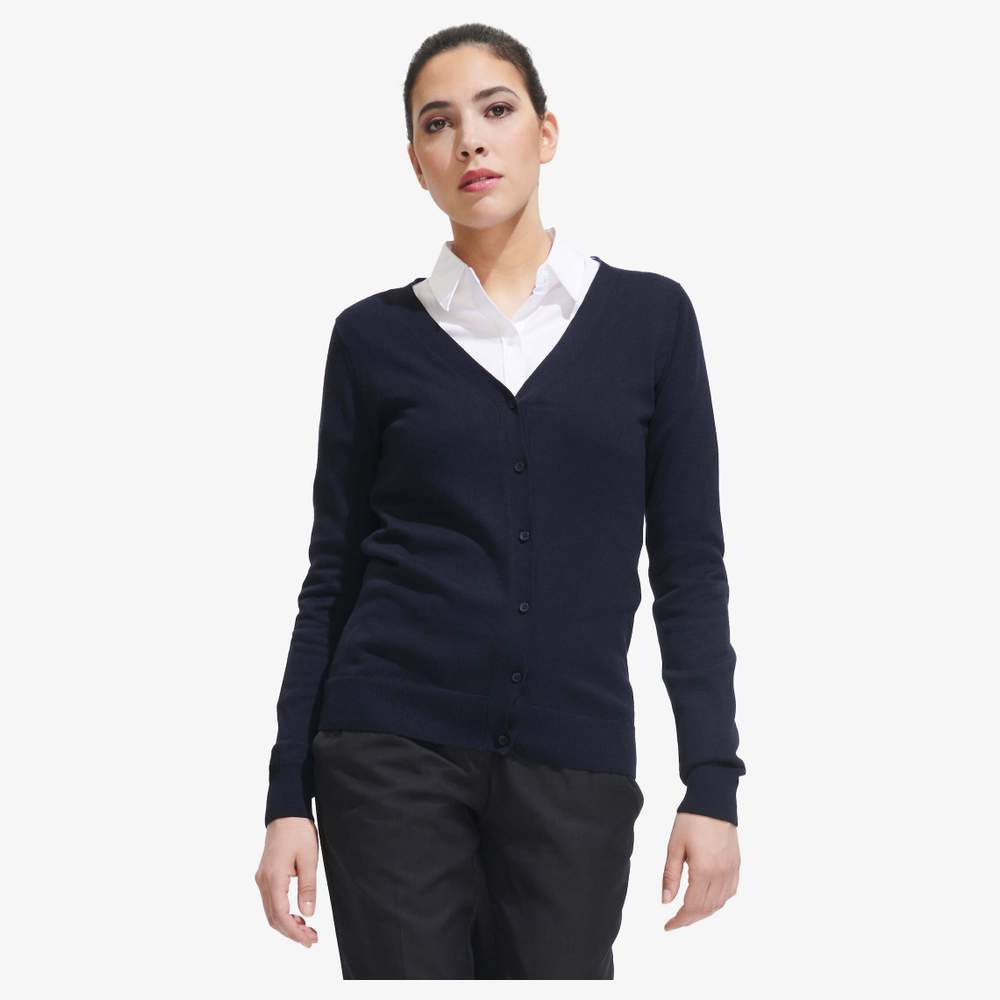 Gilet dame knap kol V strømpe jersey 280 bestående af 50% bomuld og 50% akryl. Dette gilet præsenterer en klassisk stil med opstillede ærm og håndledder såvel som bunde med kant rib med elastfiber.