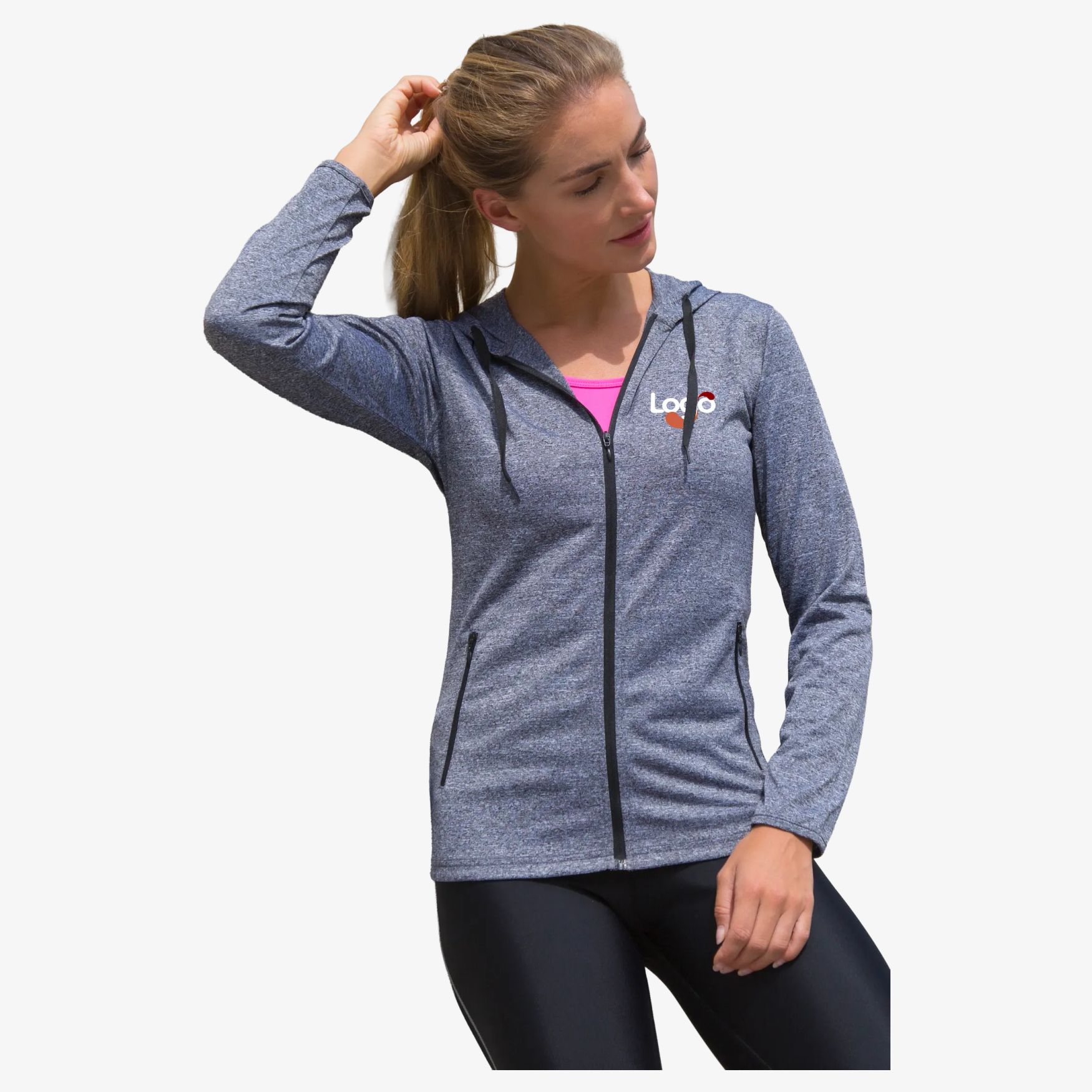 Womens Hooded tee Jacket er en let hættetrøje i strækstof, egnet til sport. Hurtigtørrende materiale og figursyet pasform giver god bevægelsesfrihed. Sidelommer med lynlås gør det muligt at have små genstande lige ved hånden.