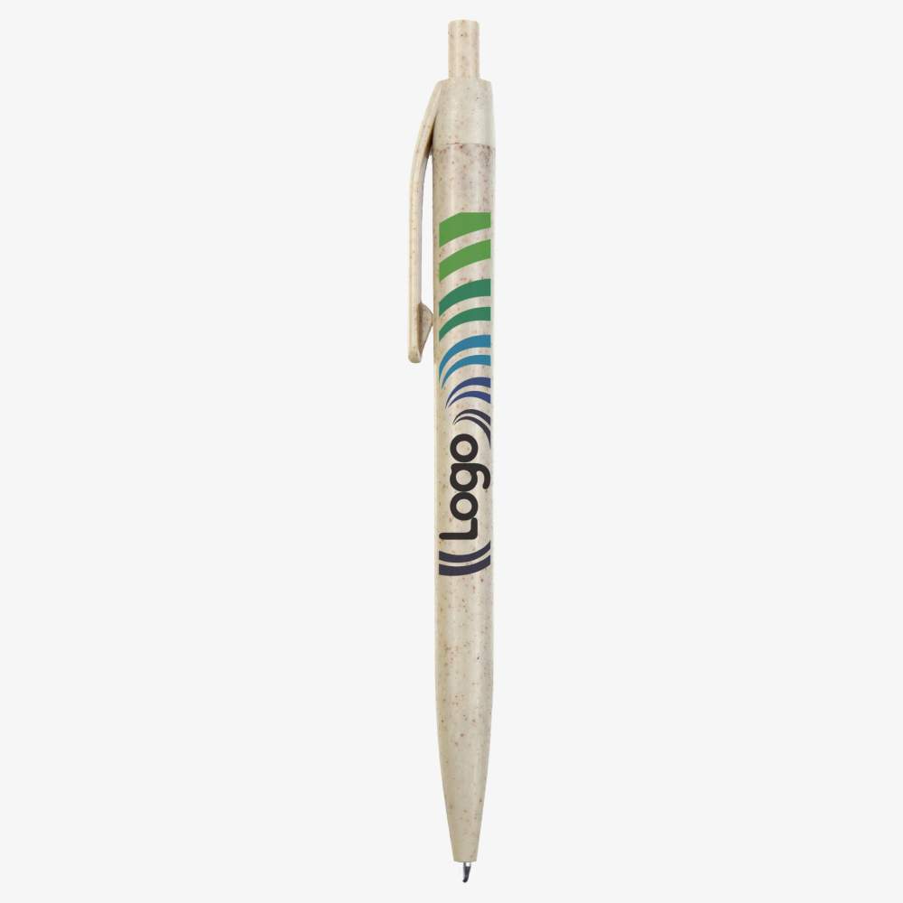 Denne knapskrivepen er lavet af hvedefiber og ABS, der tilbyder en økologisk og bæredygtig alternativ. Den er udstyret med blåt blæk af høj kvalitet til en glat og præcis skrivning. Den ergonomiske design sikrer en behagelig håndtagning. Denne pen kan personaliseres, så du kan tilføje dit logo, en besked eller et visuel til effektiv kommunikation.