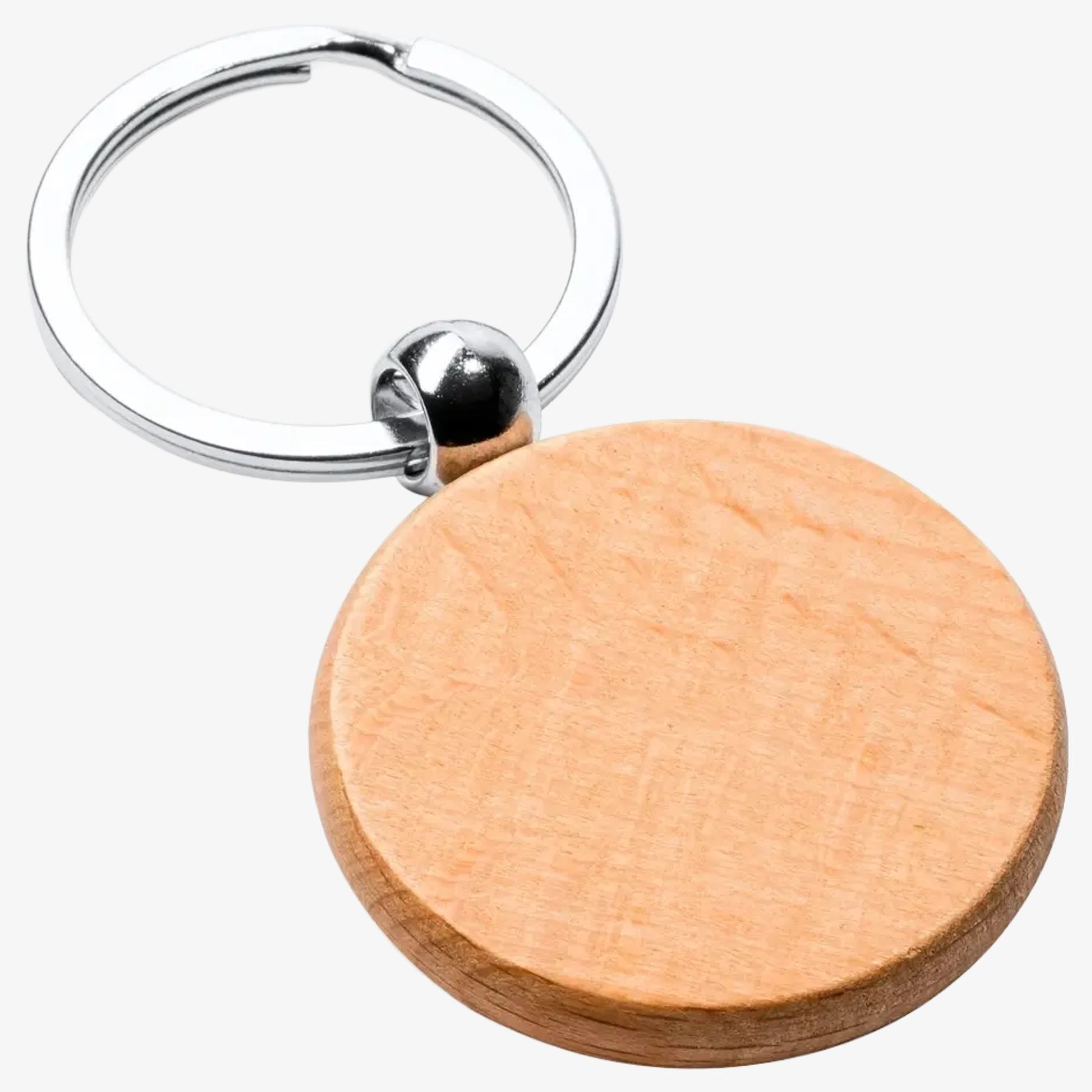 Det runde nøglevedhæng er fremstillet i naturligt træ med en metalring. Denne kombination af materialer muliggør almindelig brug samtidig med en tilpasningsmulighed.