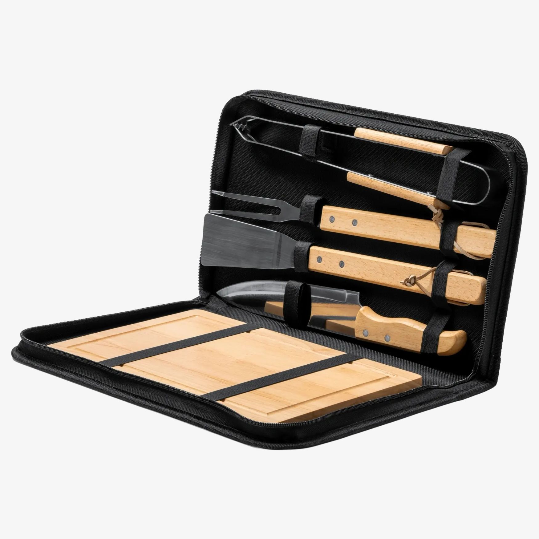 Webek grillsæt med 4 tilbehør i rustfrit stål med træhåndtag samt et skærebræt i træ. Sæt egnet til forberedelse og servering ved grillen. Mål: 25 x 38,5 x 5 cm.