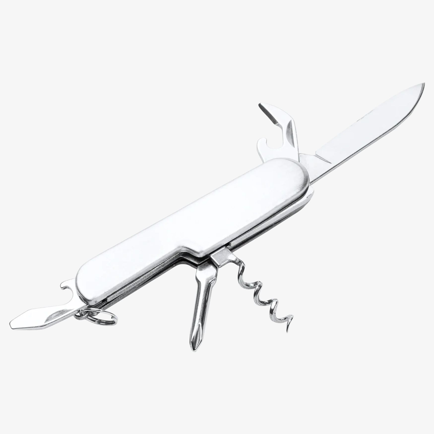 ZORA Swiss kniven er lavet i rustfrit stål med en aluminiumskonstruktion. Den indeholder seks nyttige funktioner: kniv, flaskeåbner, dåseåbner, proptrækker, skruetrækker og nøglering.