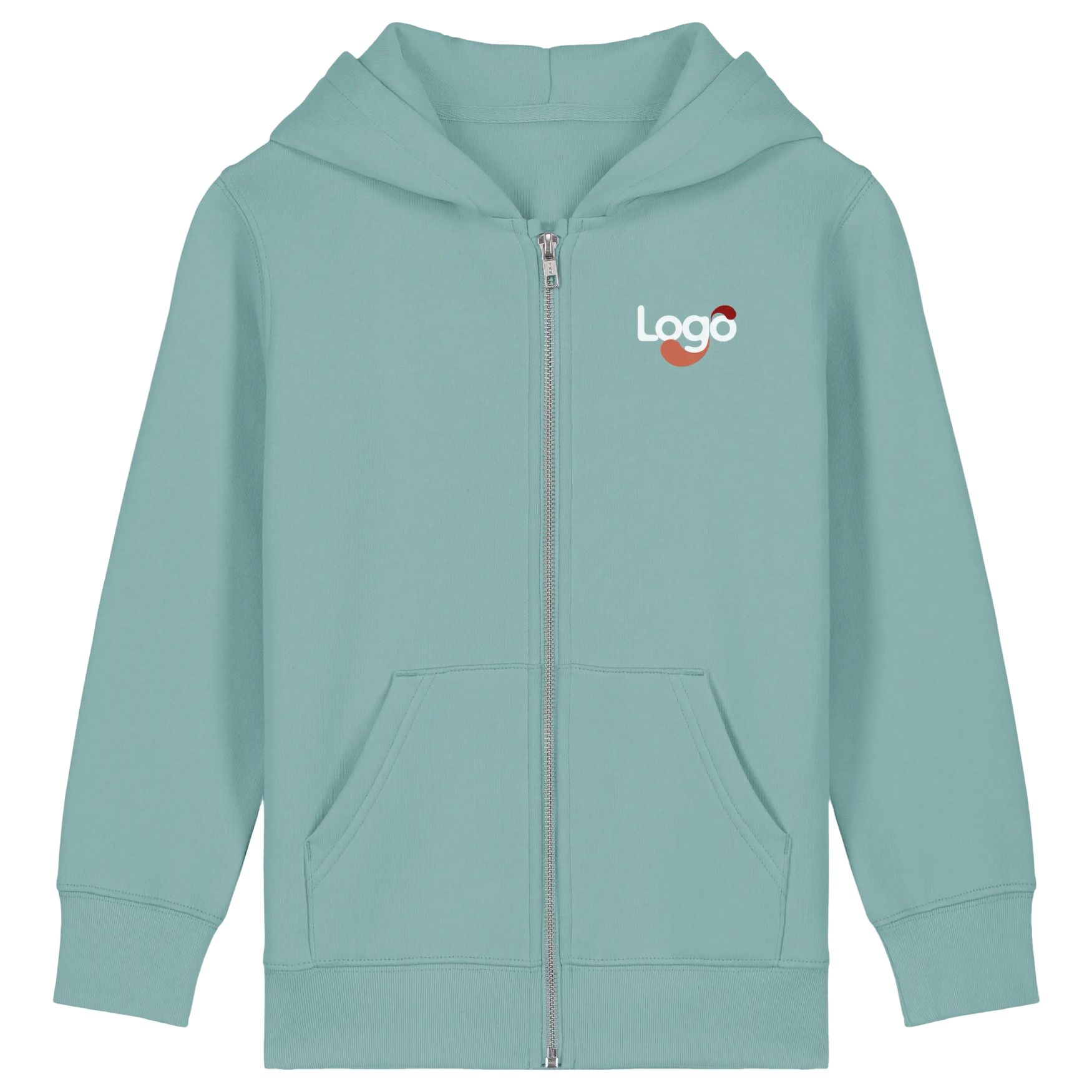 Den ikoniske børns sweatjakke med fuld zip. Mansjetter med øvre ende. Cap med inderside af hovedmaterialet. Enkel jerseybånd på indersiden af nakkebag. Halvmåne af hovedmaterialet på bagsiden af nakken med dobbelt stik på 3 mm. Enkel søm på halsens søm. 1x1 kanter på ærmernes nederste kant og nederste kant. Søm på 2 nåle centreret på sømmen på nederste kant, håndled og armhul. Kanguro-pose med søm på 1 nål på 3 mm. Synlig metalzip i midten foran. Sammensætning: 100% biologisk bomuld, spundet og kæmmet. Denne sweatjakke kan tilpasses, så du kan tilføje dit logo eller et unikt visuel ved broderi.
