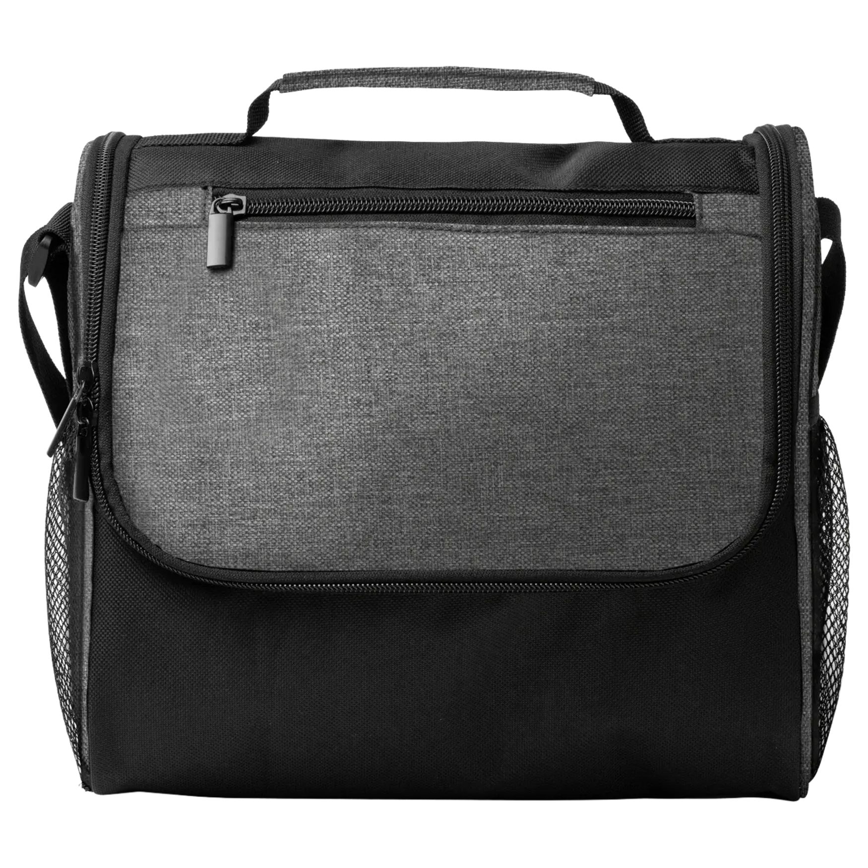Den isolerede taske GAVINS er lavet af RPET 600 D med et isoleret hovedrum indvendigt. Den indeholder en lynlåslomme foran, to sidelommer og en justerbar bærestrop.