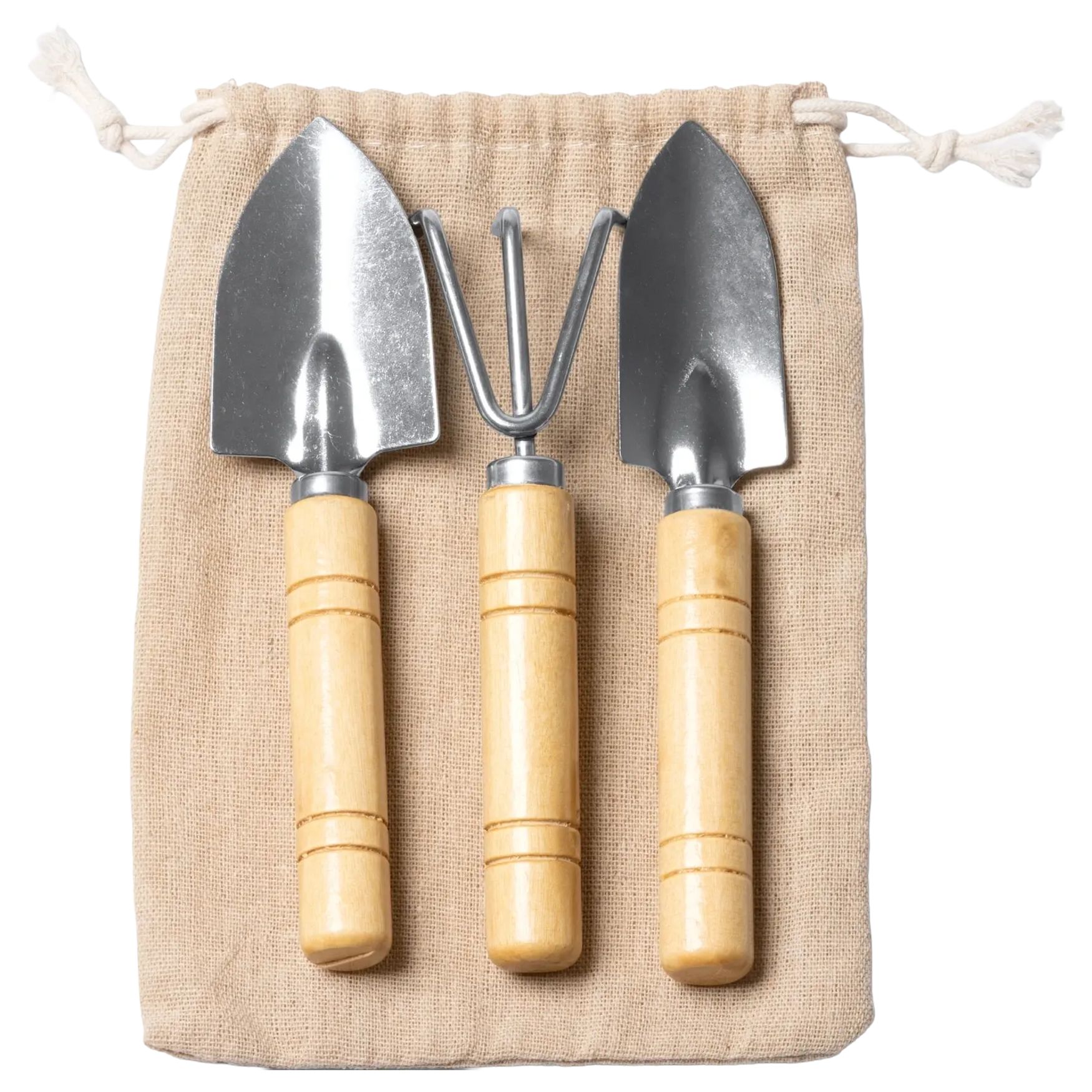 Havearbejdsættet inkluderer tre tilbehør i rustfrit stål med bambushåndtag og en pose i bomuld. Værktøjerne opbevares i en miljøvenlig æske.