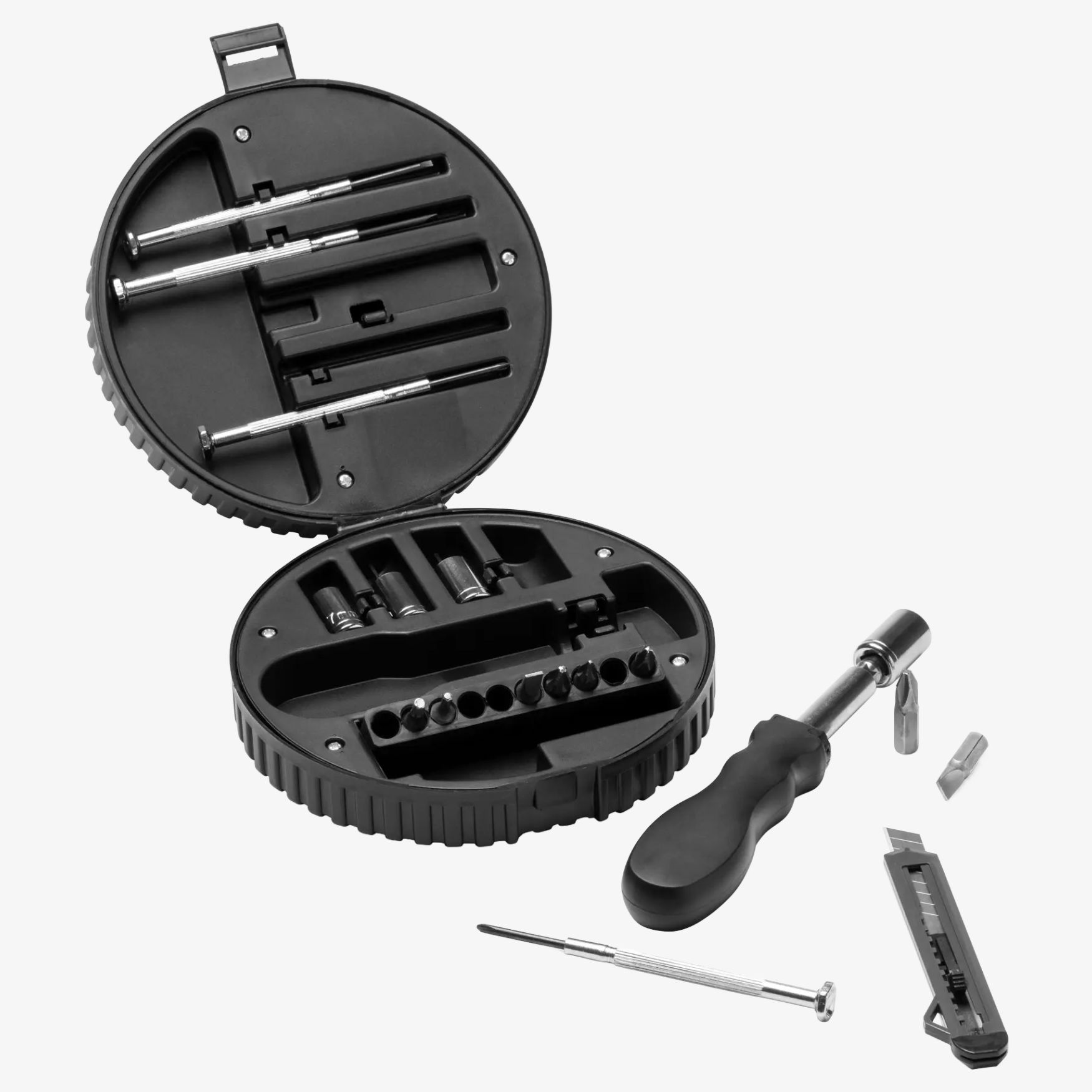 TURNER indeholder 20 forskellige tilbehør inklusive cutter, unbrakonøgler, krydskærv- og fladhovedskruetrækkere samt et fastgørelsesværktøj. Sættet er i en hjulformet kompakt og nemt transportabel taske. Dimensioner: 4,9 x 12,9 cm.