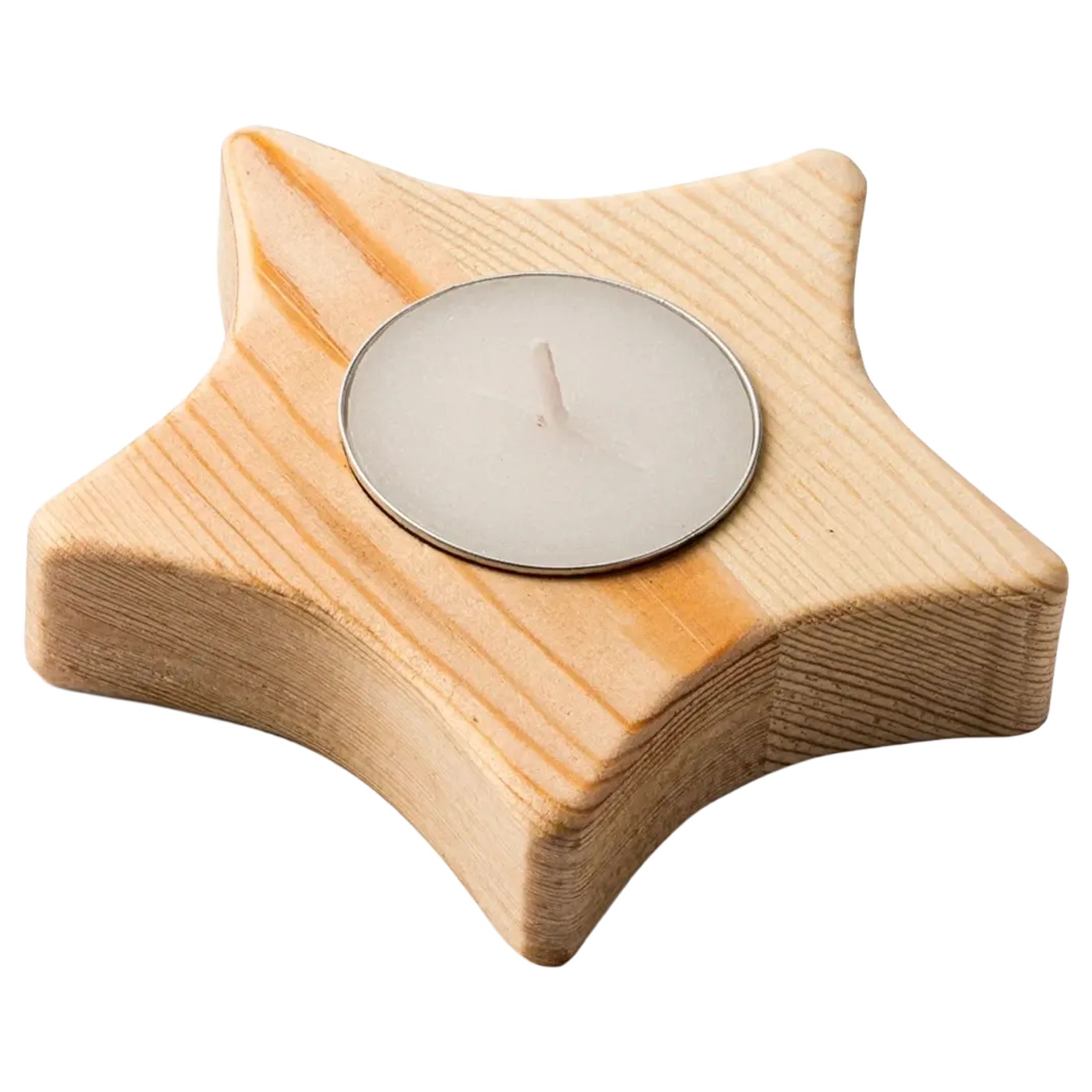 Det stjerneformede lys har en fod af fyrretræ med julemotiver. Det er lavet af paraffin.