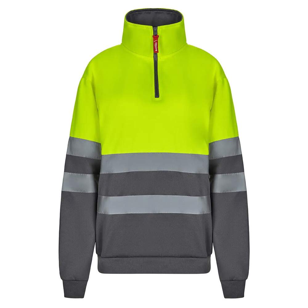 Tofarvet Sweat med zipperhals designet til øget synlighed. Det har refleksbånd på brystet og ærmene for at forbedre sikkerheden under dårlige lysforhold. Kantbåndet på ærmene og taljen sikrer en behagelig pasform. Dette tøj er velegnet til forskellige arbejdsmiljøer, der kræver god synlighed.