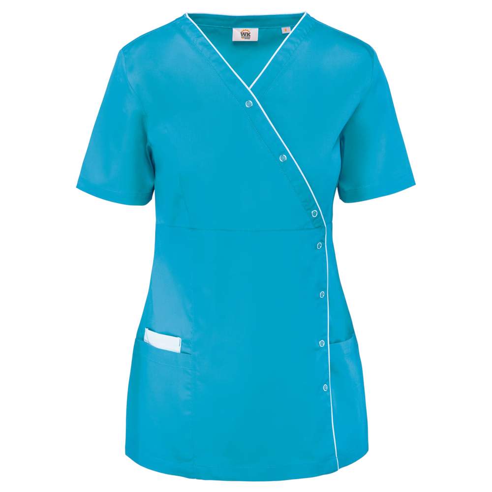 Arbejdsbluse til kvinder med trykbrydere. Justeret skæring takket være prøver foran og bagpå for en mere feminin skæring. V-krage, asymmetrisk knapning ved trykknapper. 2 forpærer hvoraf den ene (til højre) har to afdelinger (indvendig lomme med kontrasterende kant). Kontrasterende passepartout rundt om kraven og langs låsningen. Navnetiket inden i tøjet. Mærketiket Tear Away. Væv sergé. Norm ISO 15797. Sammensætning: 65% polyester, 35% bomuld
