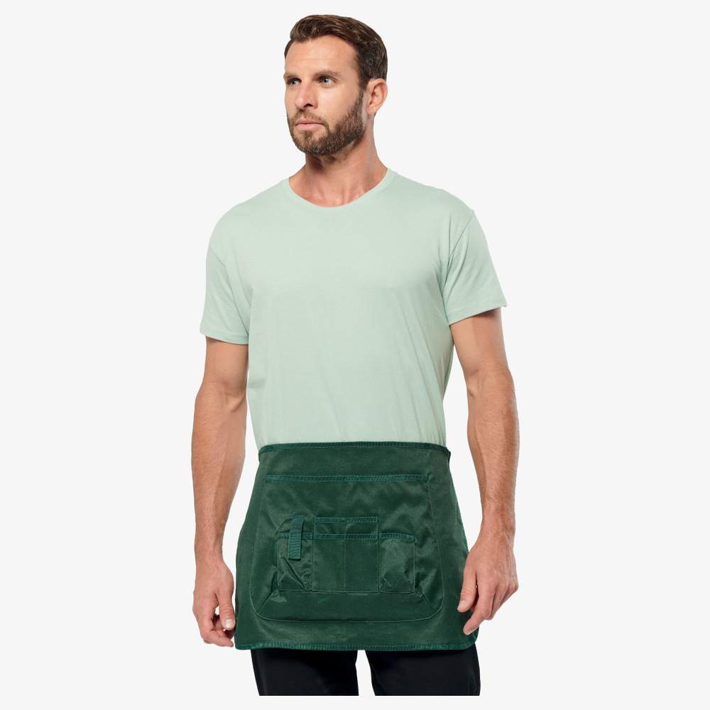 Miljøvenlig kort havearbejdstasker for både kvinder og mænd. Designet i Oxford-væv, der er belagt og vandafvisende på 4000 mm for effektiv beskyttelse. Den har to niveauer af lommer til optimal opbevaring: en stor central lømme og fire ekstra lommer, herunder en med dobbelt afdelinger og en med klap og velcro-bånd. De farvede kantlister giver den et pænt udseende. Velcro-remmen tillader justering af taskens størrelse for personlig komfort.