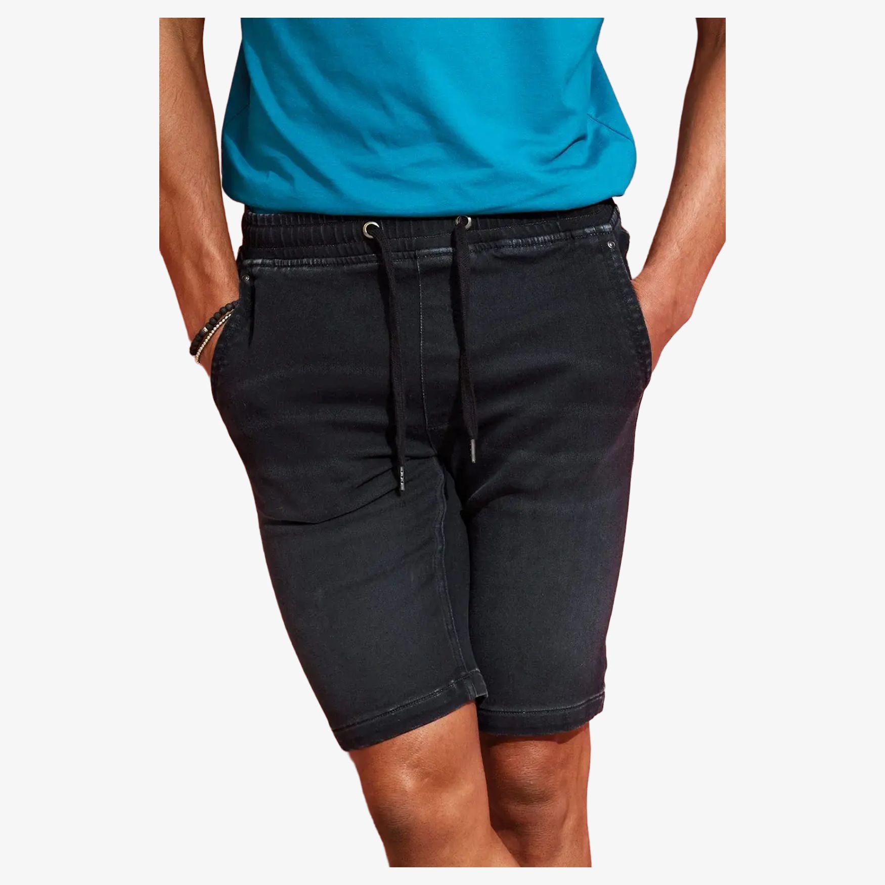 Herreshorts i denim med snøre har en justerbar elastisk linning og flere lommer for alsidig brug. Finishen giver et slidt udseende, og kontrastsømme tilføjer visuel detalje.