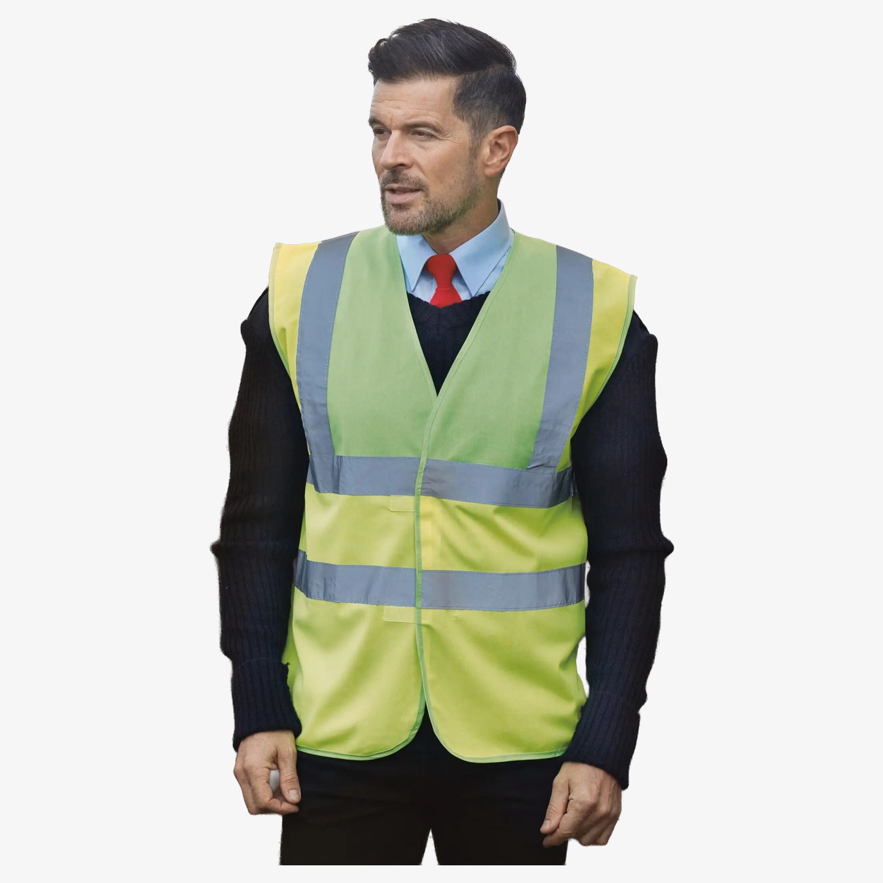 Gilet med høj synlighed af 100% polyester med fastgørelse ved klæbebånd. To reflekterende strimler på 5 cm omkring kroppen og en på hver skulder. Overholder normen EN ISO20471:2013 kategori 2 til farverne Hi-Vis Yellow, Hi-Vis Orange og Orange/Hi Vis Yellow. Overholder normen EN ISO20471:2013 kategori 1 til farverne Black/Hi Vis Yellow, Lime/Hi Vis Yellow, Navy/Hi Vis Yellow, Purple/Hi Vis Yellow, Paramedic Green/Hi Vis Yellow, Red/Hi Vis Yellow, Raspberry/Hi Vis Yellow og Royal Blue/Hi-Vis Yellow. Overholder normen EN 1150:1999 PASS til farven Lime.
