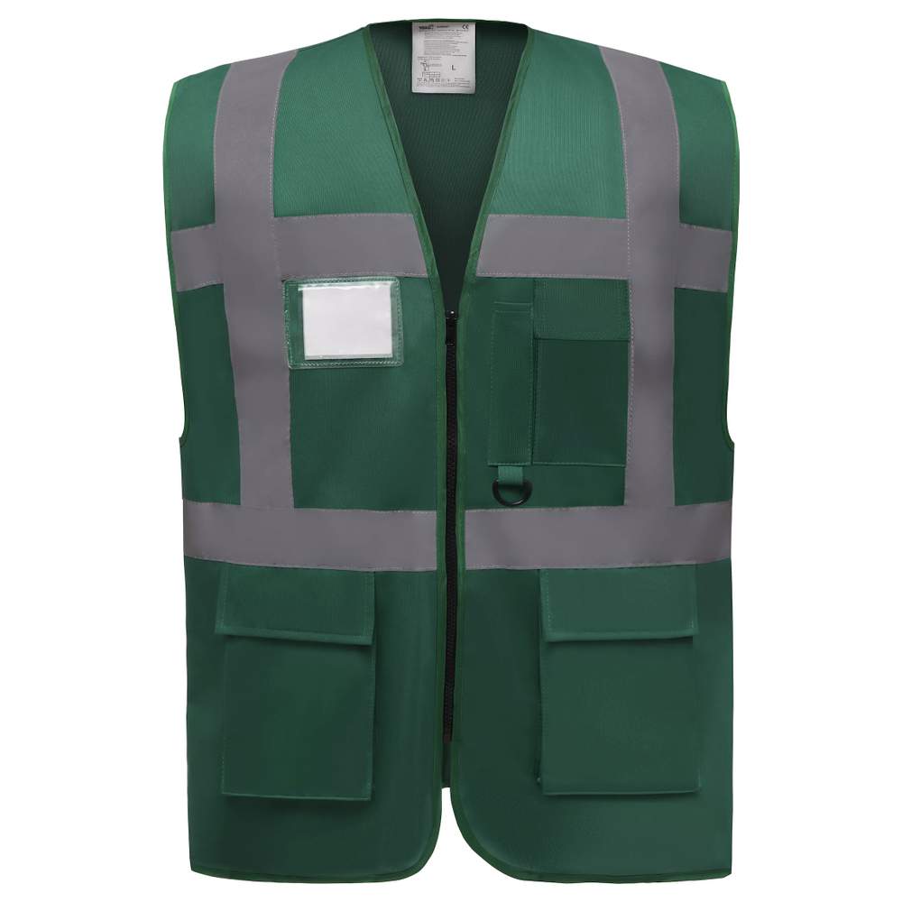 Denne multifunktionelle højvisibilitet vest tilbyder en fremragende synlighed og funktion. Den er udstyret med refleksstrimler på 5 cm bredde omkring krop og skuldre for øget sikkerhed. Den har en lomme til mobiltelefon eller walkie-talkie samt to nederste lommer med klapper, der kan nås fra oven og siden, inklusive lommer til penne og nøgler. En identitetskortslomme findes også på højre side, og et stort område bagpå tillader dekoration.
