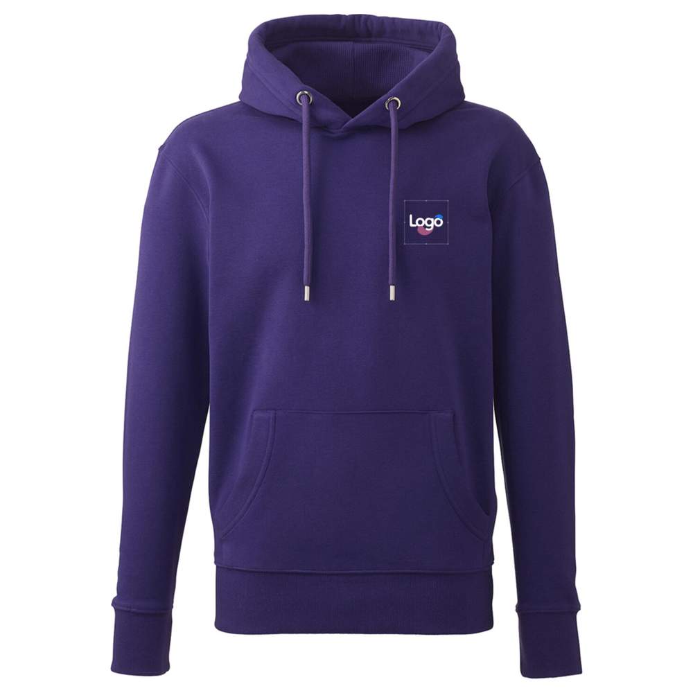 Anthem Kapuzenpullover für Herren, hergestellt aus weichem Hautfühlstoff. Dieser Pullover hat eine gestrickte, geriffelte Kapuze mit einem Zugband aus Polyester und ein gefüttertes Innenfutter für optimalen Komfort. Die doppelnadeligen Säume gewährleisten eine dauerhafte Qualität. Er ist mit gerippten Bündchen versehen, die in zwei Schritten geschnitten und genäht sind, sowie einer praktischen Kängurutasche. Das Größenschild passt sich der Farbe des Kapuzenpullovers an. Die Zusammensetzung beträgt 80% Bio-Baumwolle, 20% recyceltes Polyester für unifarbige Farben; 73% Bio-Baumwolle, 21% recyceltes Polyester, 6% Viskose für Grau Melange; und 78% Bio-Baumwolle, 21% recyceltes Polyester, 1% Viskose für Grau Asch. Dieser Kapuzenpullover ist personalisierbar und bietet die Möglichkeit, Ihr Logo oder Bild per Stickerei hinzuzufügen.