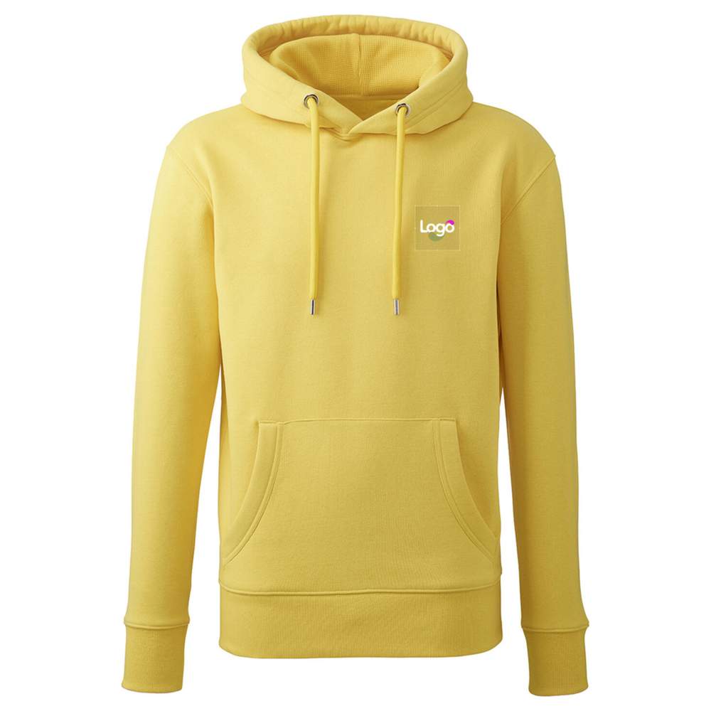 Anthem Kapuzenpullover für Herren, hergestellt aus weichem Hautfühlstoff. Dieser Pullover hat eine gestrickte, geriffelte Kapuze mit einem Zugband aus Polyester und ein gefüttertes Innenfutter für optimalen Komfort. Die doppelnadeligen Säume gewährleisten eine dauerhafte Qualität. Er ist mit gerippten Bündchen versehen, die in zwei Schritten geschnitten und genäht sind, sowie einer praktischen Kängurutasche. Das Größenschild passt sich der Farbe des Kapuzenpullovers an. Die Zusammensetzung beträgt 80% Bio-Baumwolle, 20% recyceltes Polyester für unifarbige Farben; 73% Bio-Baumwolle, 21% recyceltes Polyester, 6% Viskose für Grau Melange; und 78% Bio-Baumwolle, 21% recyceltes Polyester, 1% Viskose für Grau Asch. Dieser Kapuzenpullover ist personalisierbar und bietet die Möglichkeit, Ihr Logo oder Bild per Stickerei hinzuzufügen.