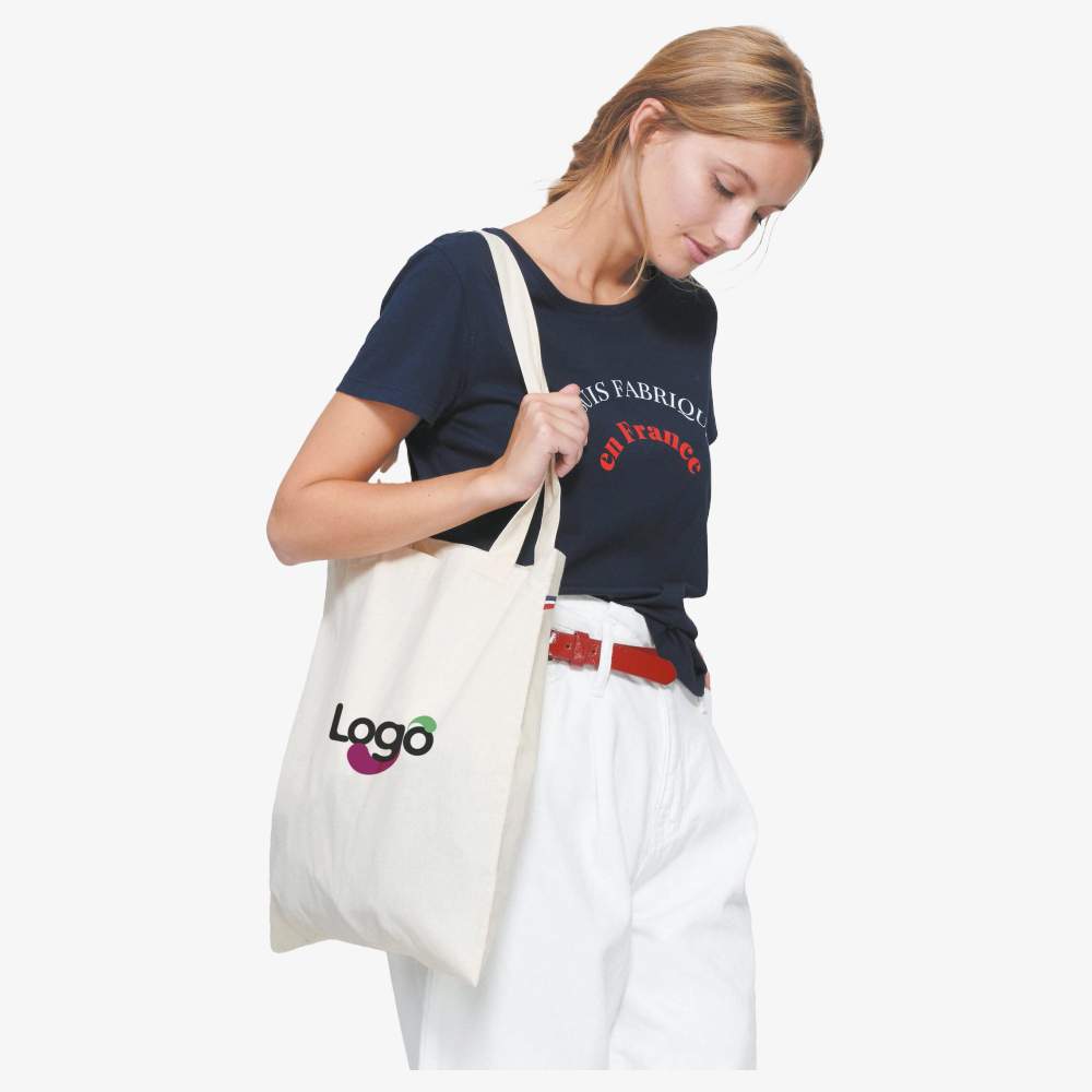 Einkaufstasche hergestellt in Frankreich, konzipiert für den täglichen Gebrauch. Sie verfügt über zwei Griffe, die einen Tragetragegriff oder eine Schultertasche ermöglichen. Ein subtiles dreifarbiges Detail ziert die Seite der Tasche. Ihre einzige Größe von 39 x 42 cm bietet ein Fassungsvermögen von 10 Litern, ideal zum Transportieren Ihrer Sachen. Sie ist aus Baumwolle zu 100% biologisch, stammt aus verantwortungsvoller Landwirtschaft. Diese Tasche ist personalisierbar und ermöglicht es Ihnen, Ihr Logo, eine Abbildung oder jedes andere grafische Element für eine effektive Kommunikation hinzuzufügen.